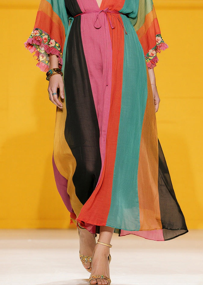 Handmade Colorblock Ruffled Striped Silk Cotton Holiday Dress Summer