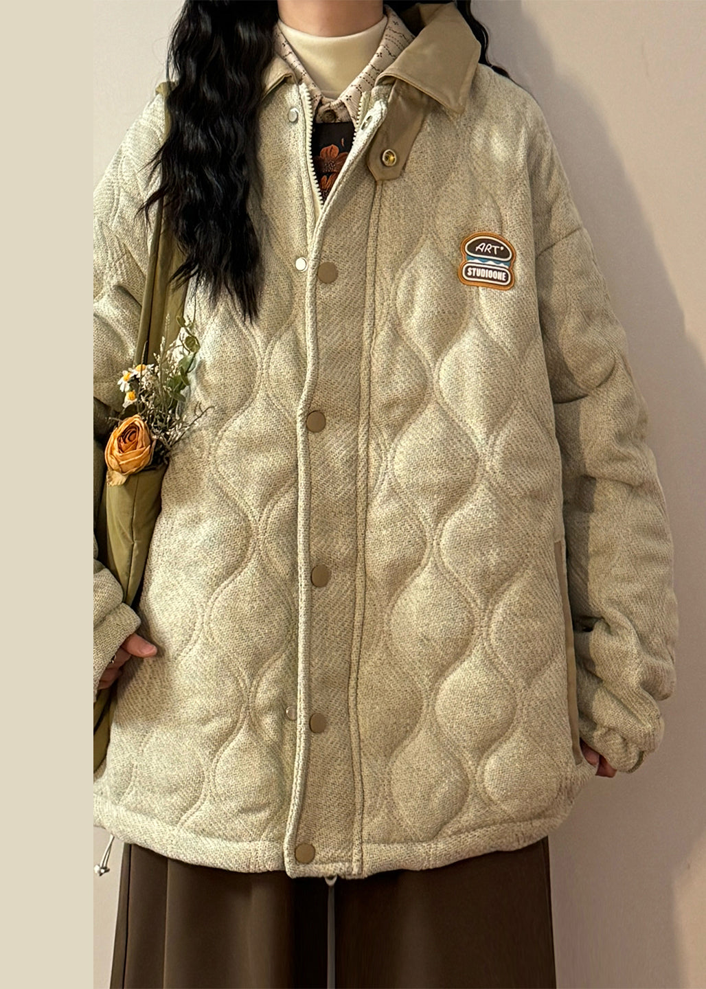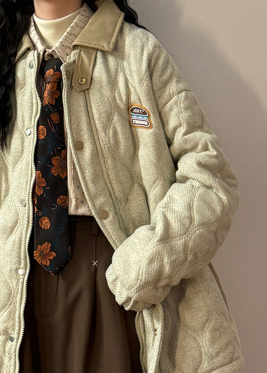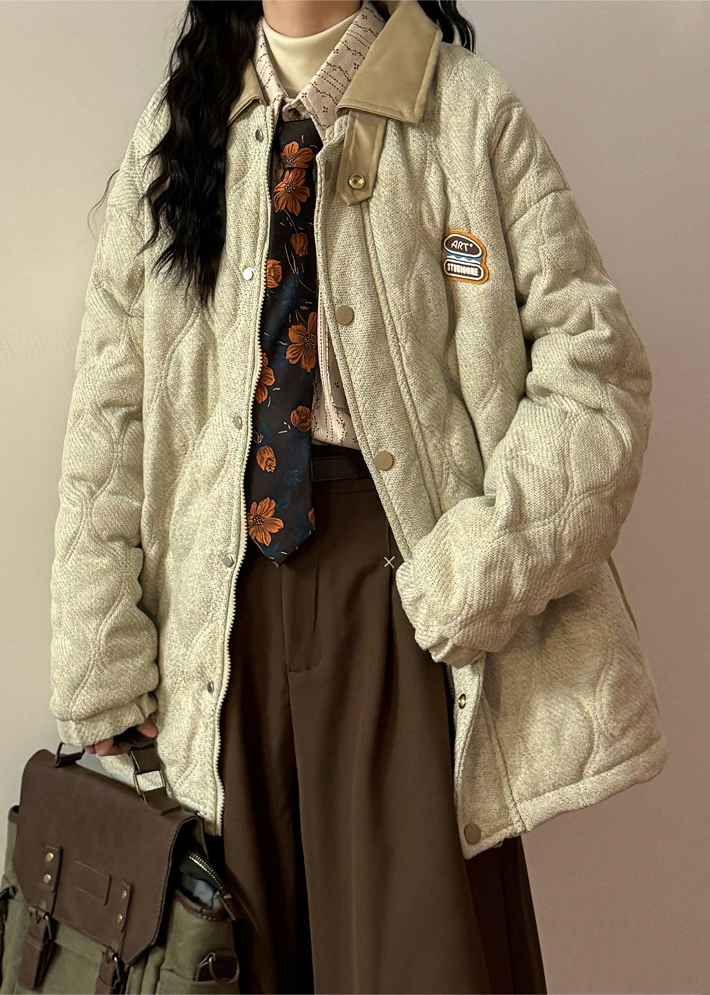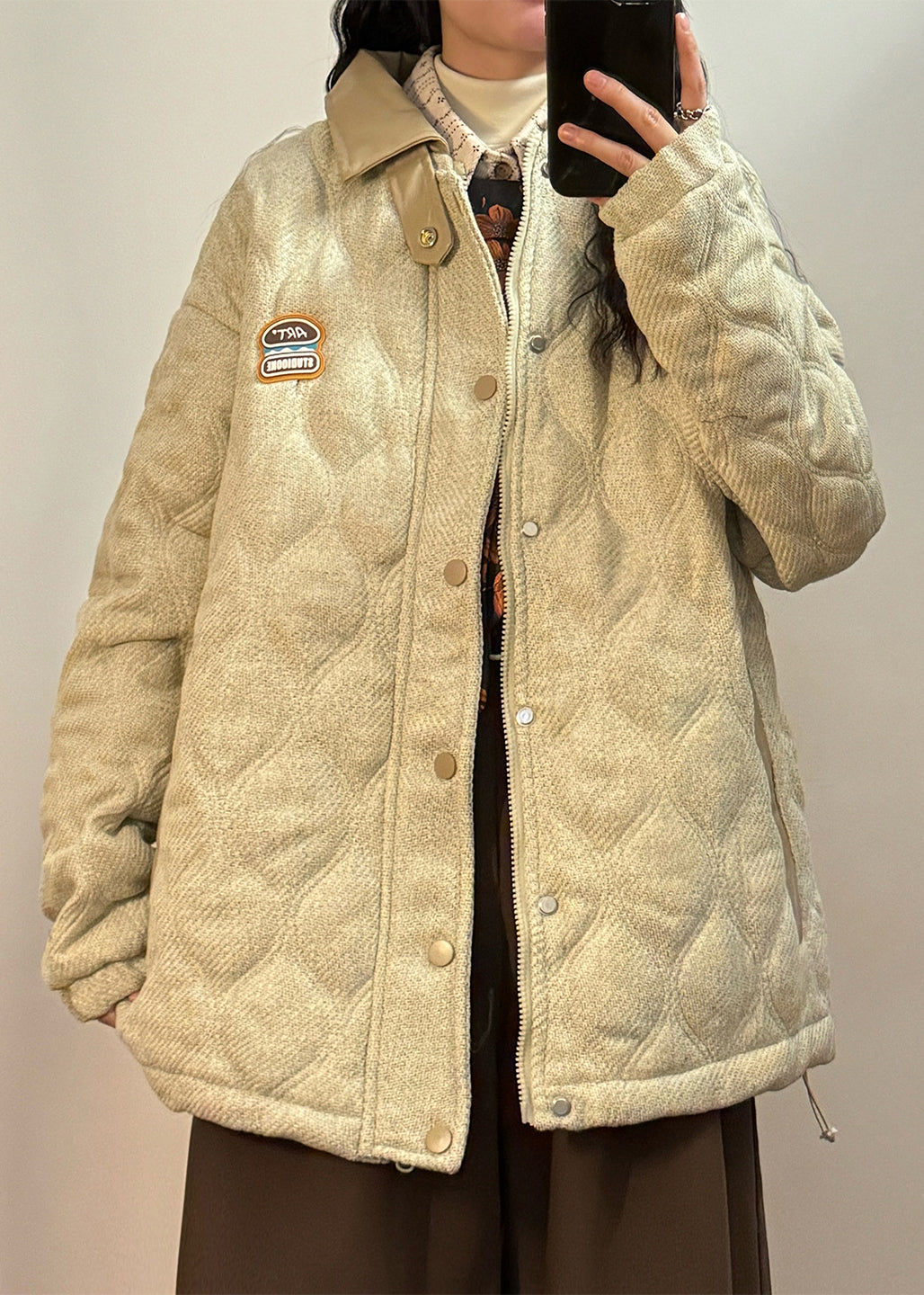 Loose Light Beige Peter Pan Collar Drawstring Faux Leather Patchwork Coat Winter