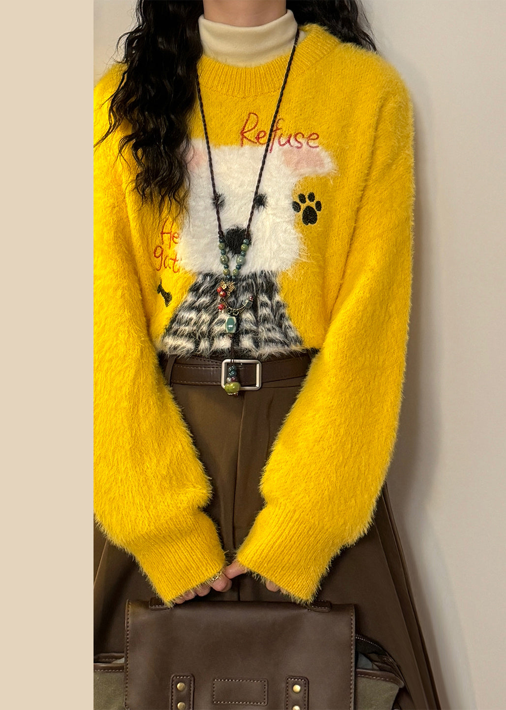New Yellow Animal Jacquard Mink Hair Knitted Sweater Spring