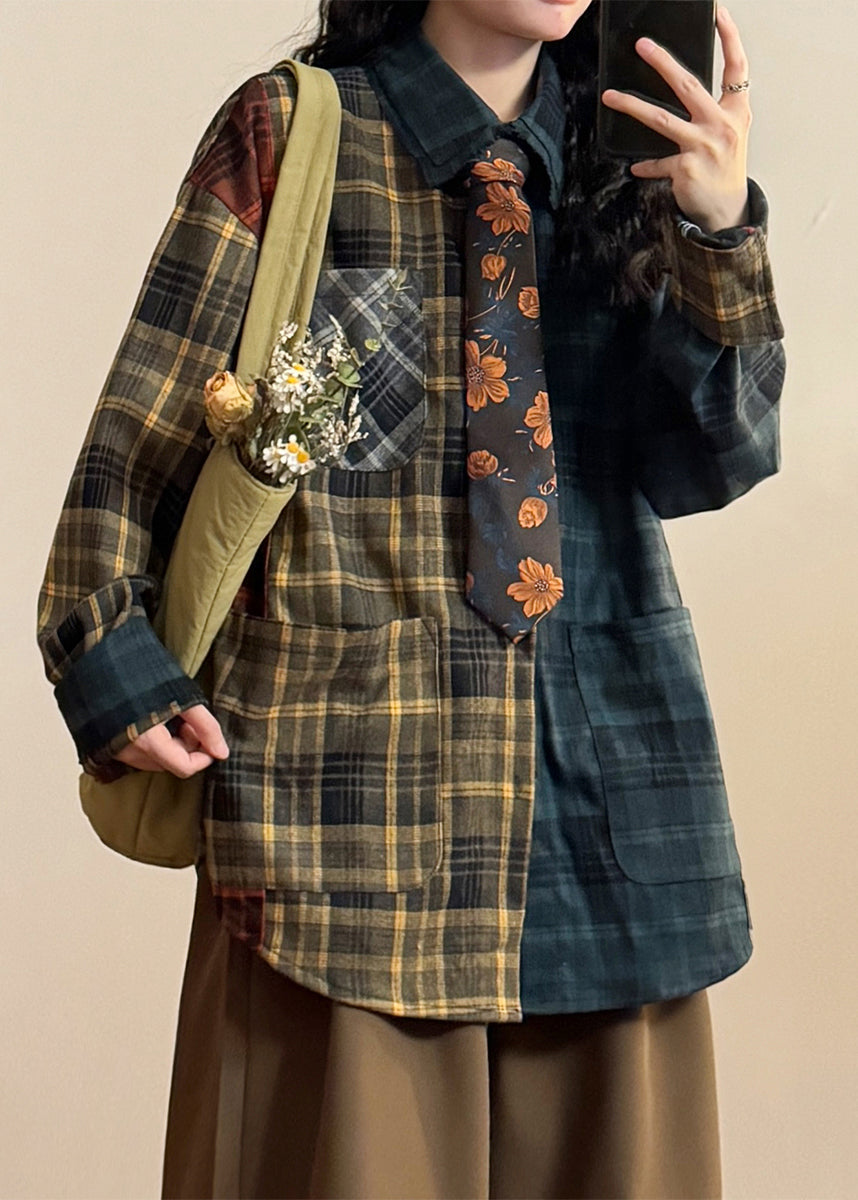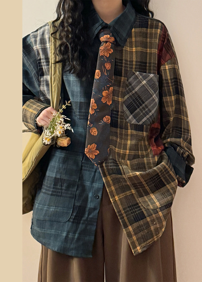 Plus Size Plaid Asymmetrical Pockets Patchwork Cotton Shirt Spring
