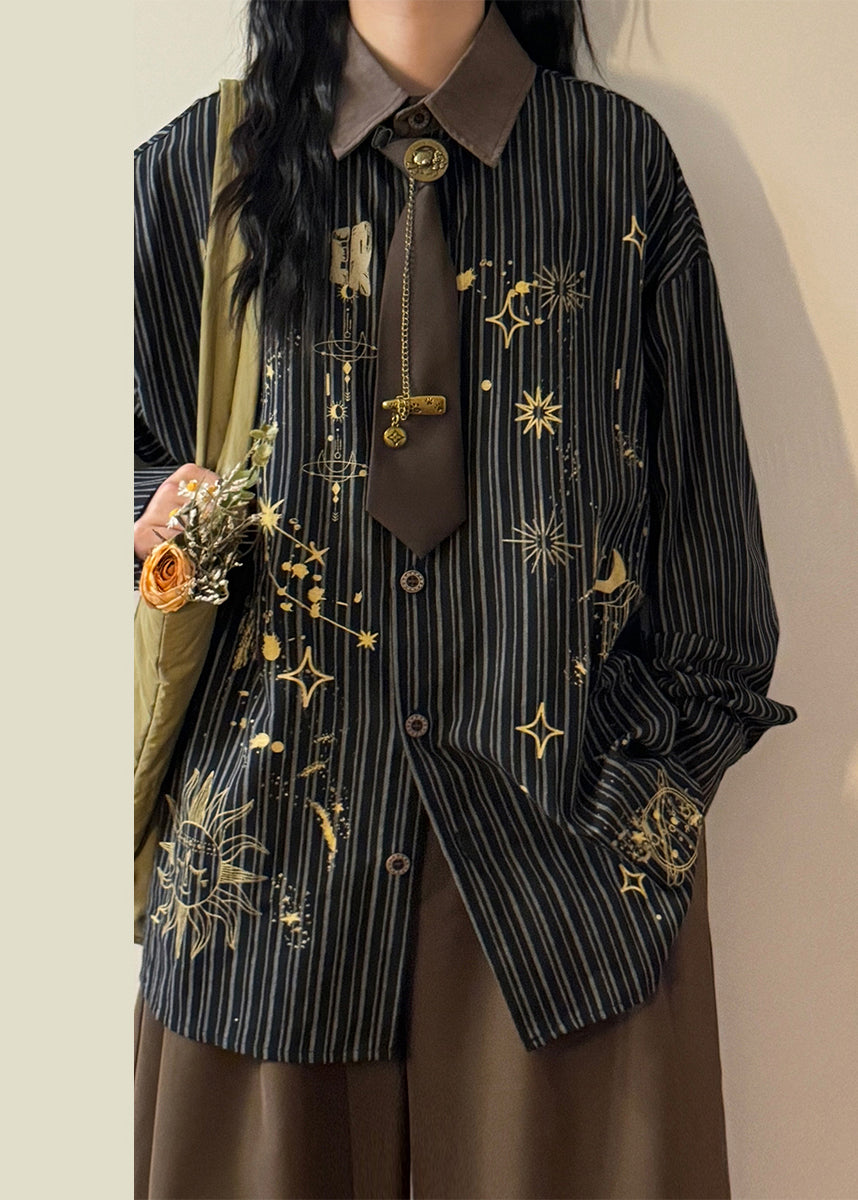 Striped Black Peter Pan Collar Print Button Cotton Blouse Spring