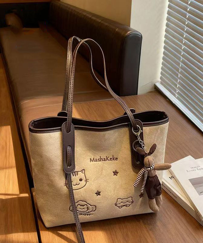 Art Beige Letter Print Pockets Solid Durable Canvas Tote Handbag