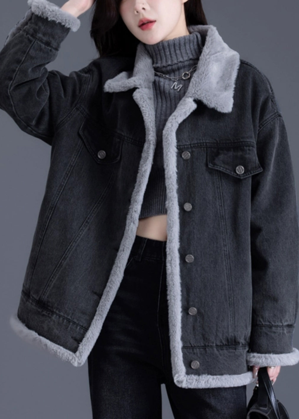 Style Black Oversized Pockets Warm Fleece Jackets Winter