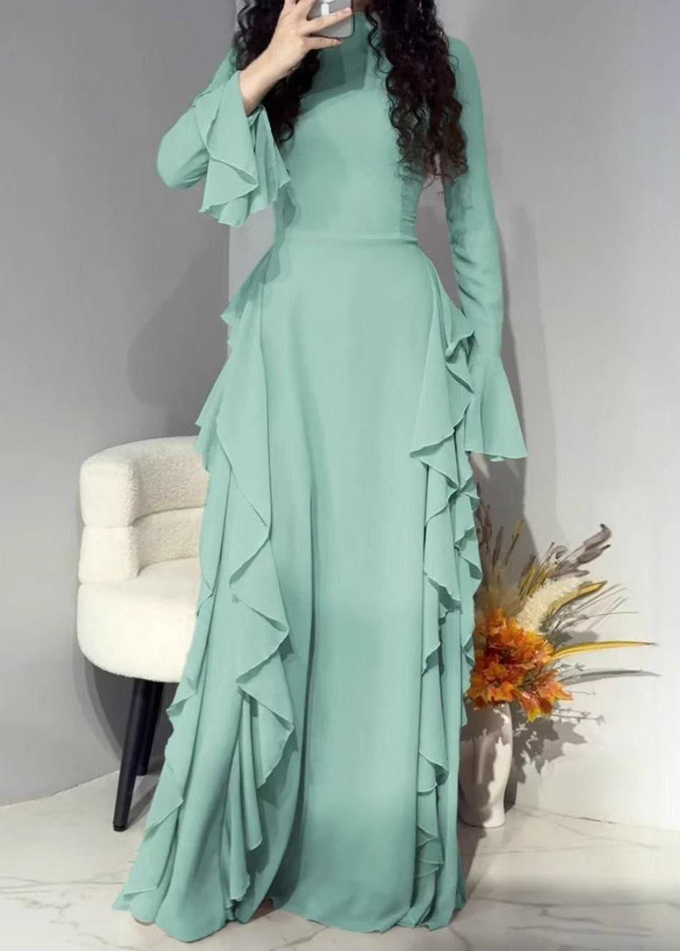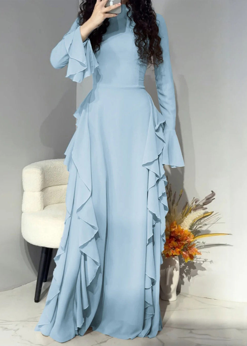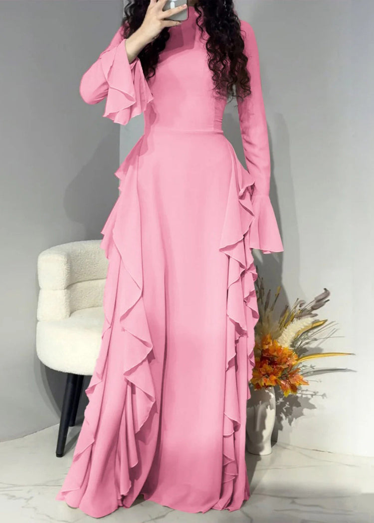 Elegant Pink Solid High Waist Chiffon Maxi Dresses Flare Sleeve