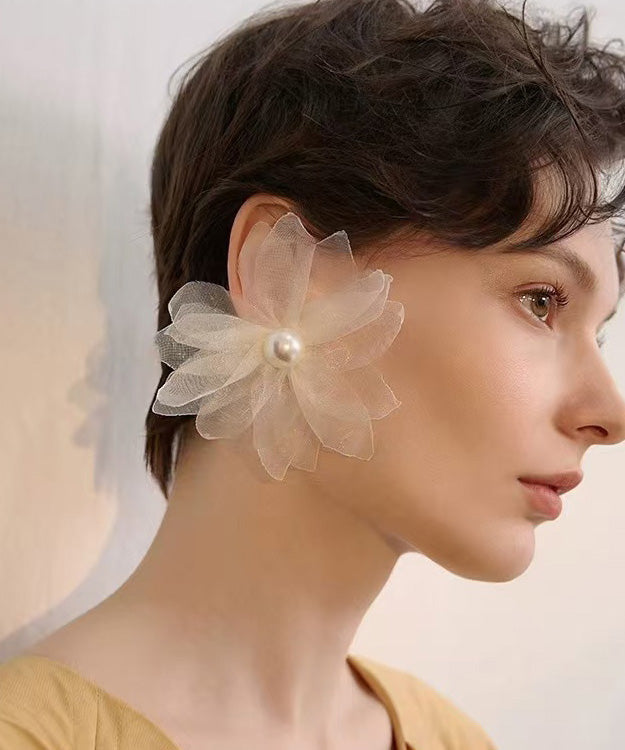 Unique Asymmetric Tulle Flower Pearl Stud Earrings