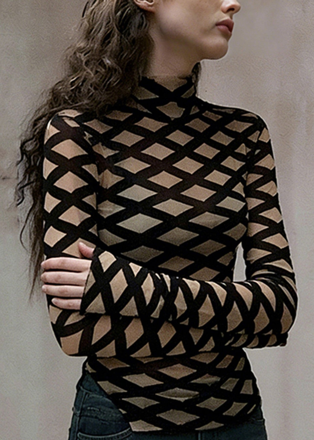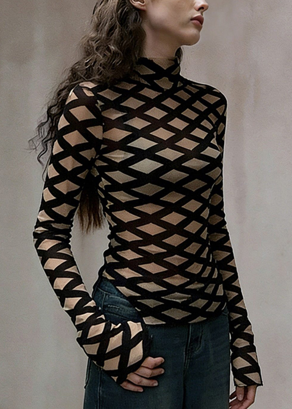 Khaki Plaid Cotton Top Stand Collar Side Open Spring