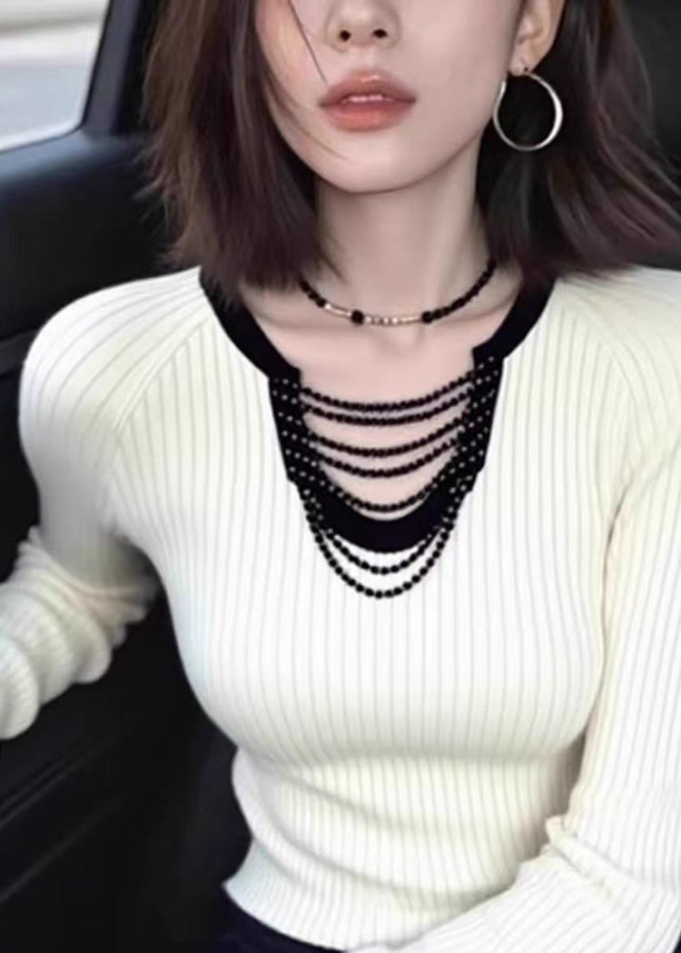 Slim Fit White Beading Hollow Out Knit Top Spring