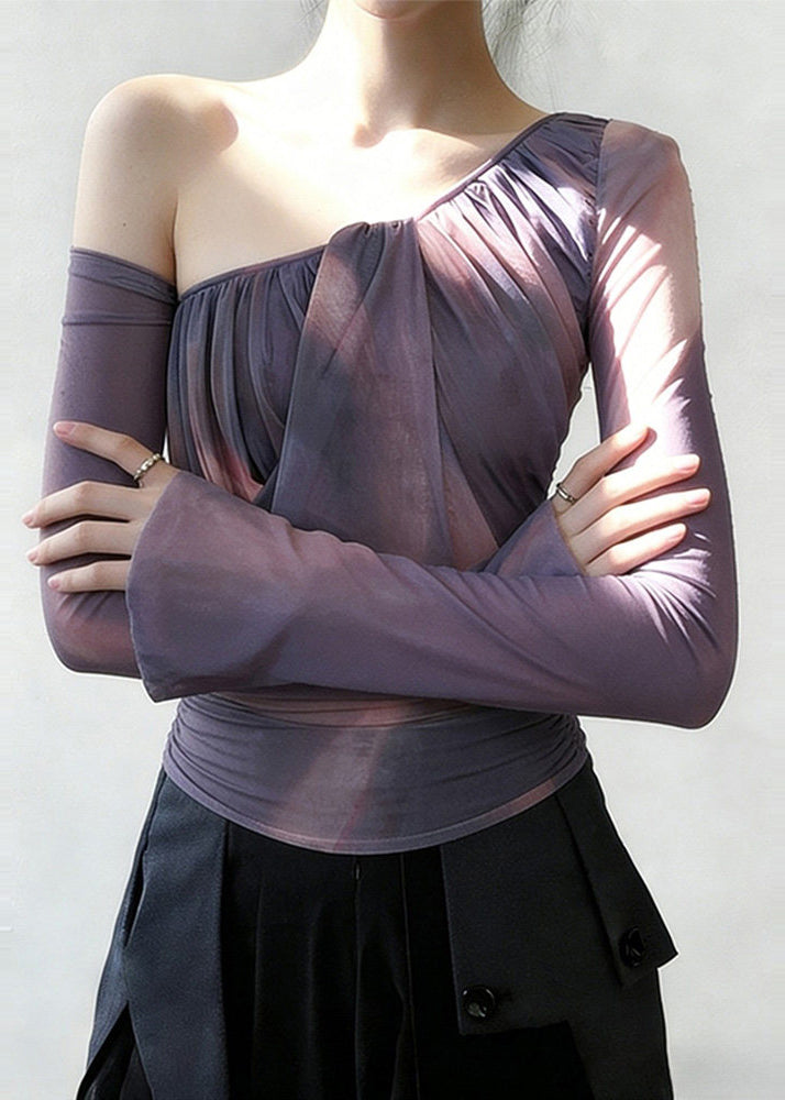 Women Purple One Shoulder Wrinkled Tulle Shirt Spring