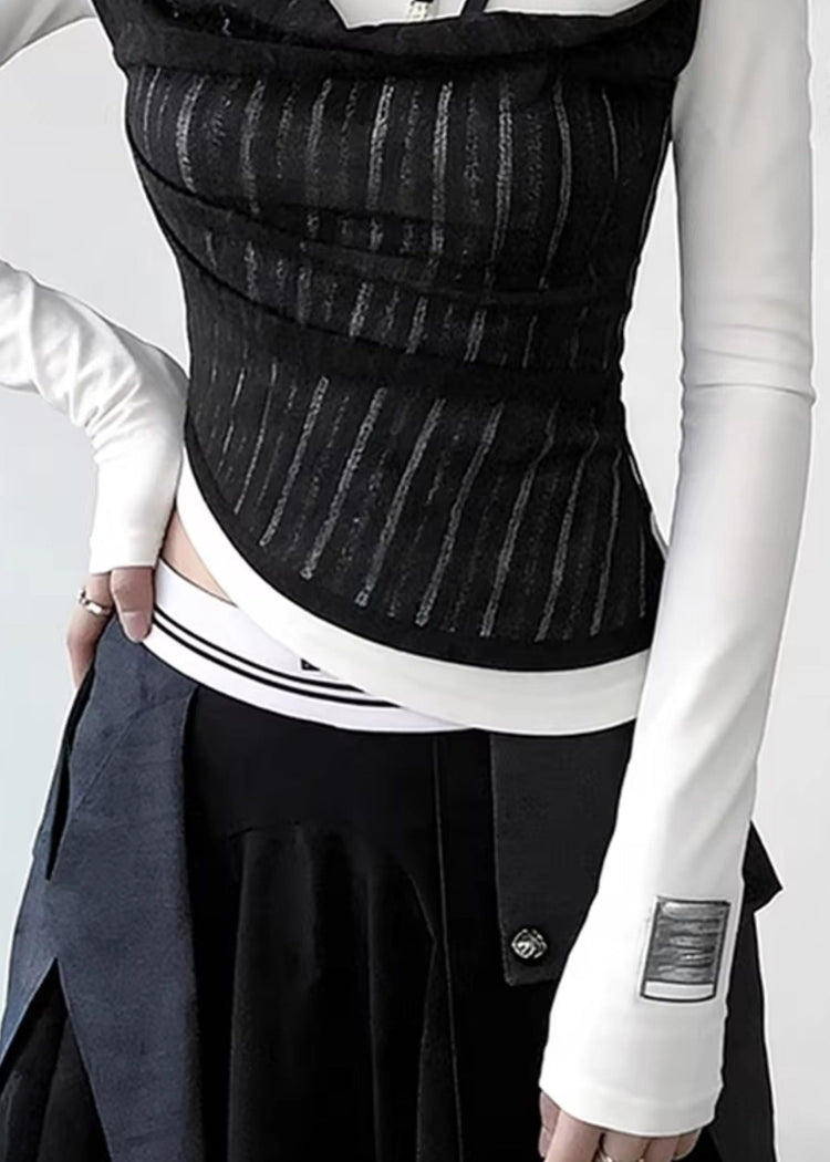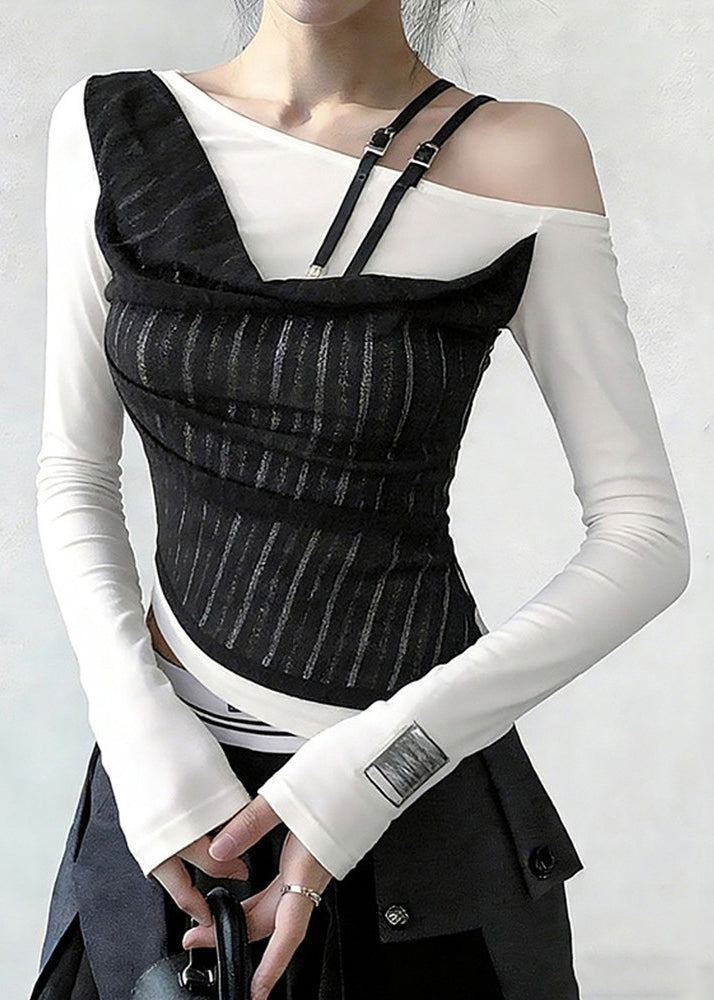 Stylish White Cold Shoulder False Two Pieces Patchwork Cotton T Shirts Spring