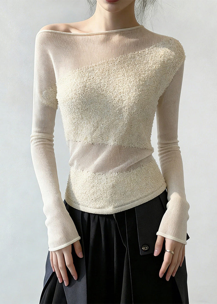 Women White Cold Shoulder Solid Patchwork Knit Sweaters Spring