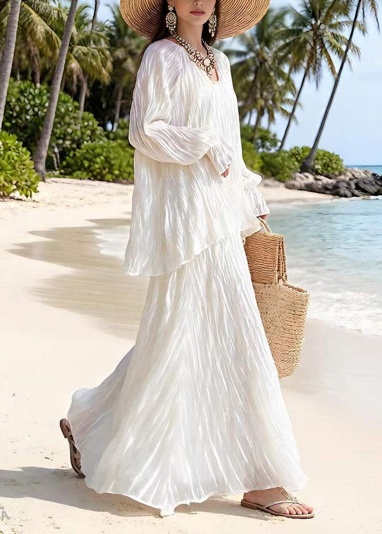 Beautiful White Wrinkled Top And Skirts Silk Two Piece Suit Set Spring