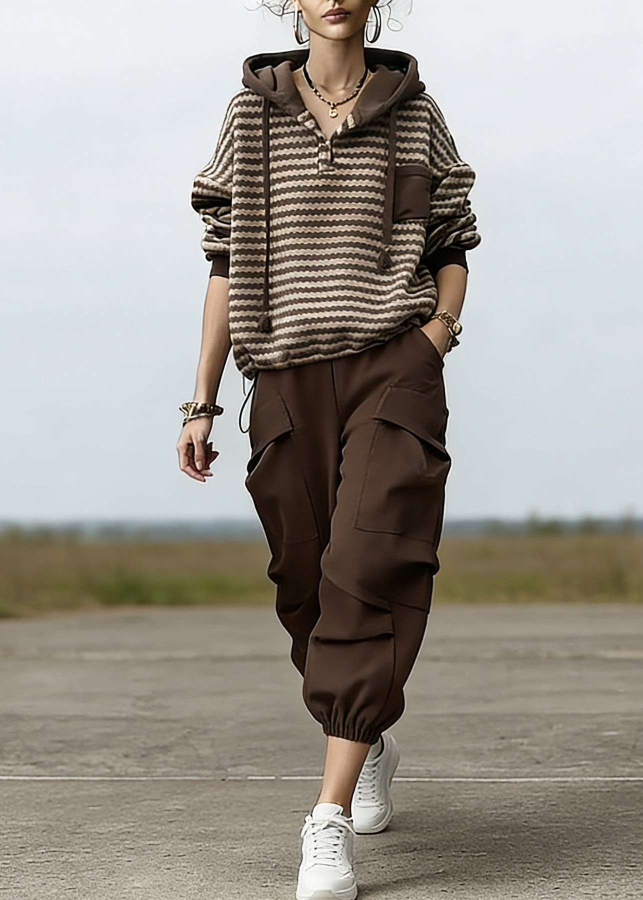 Loose Striped Drawstring Hooded Sweatshirt And Beam Pants Two Piece Set Spring