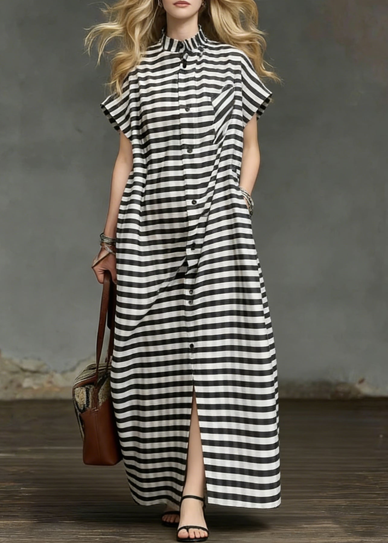 Plus Size Striped Pockets Side Open Cotton Long Dresses Summer - Omychic