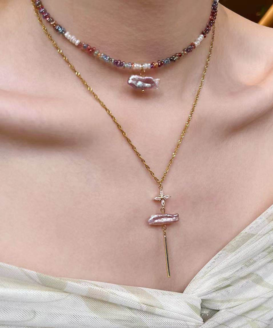 Art Colorful Pearl Stringing Beads Layering Alloy Pendant Necklace Two Piece Set