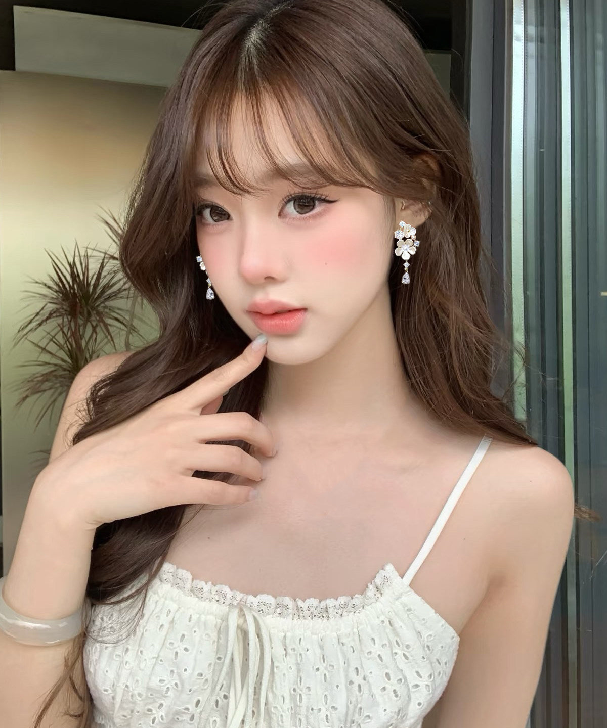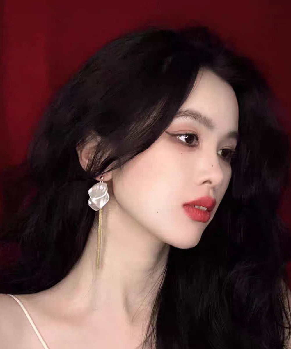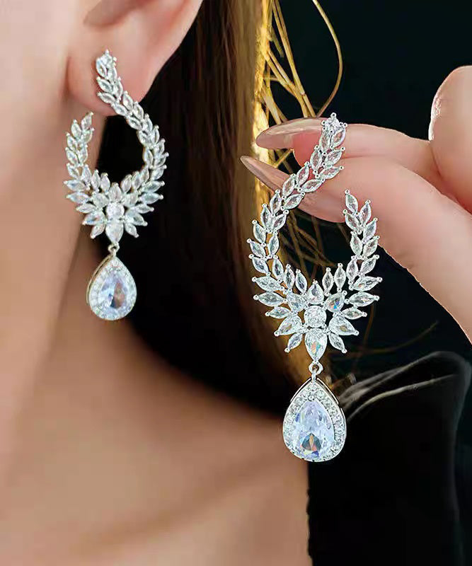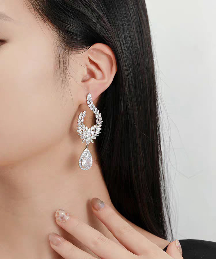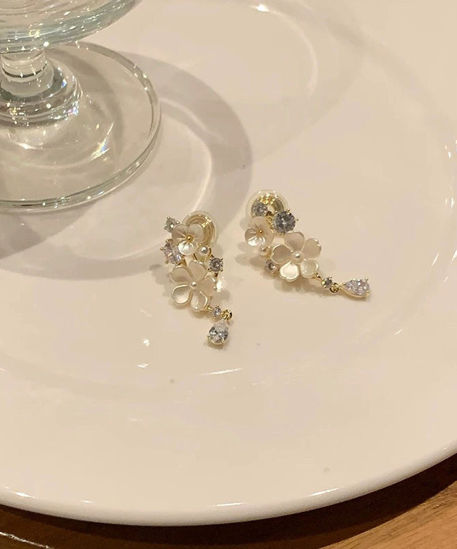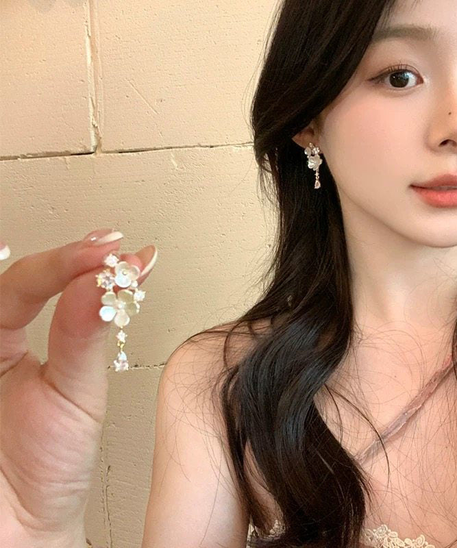 Beautiful White Alloy Zircon Floral Tassel Drop Earrings