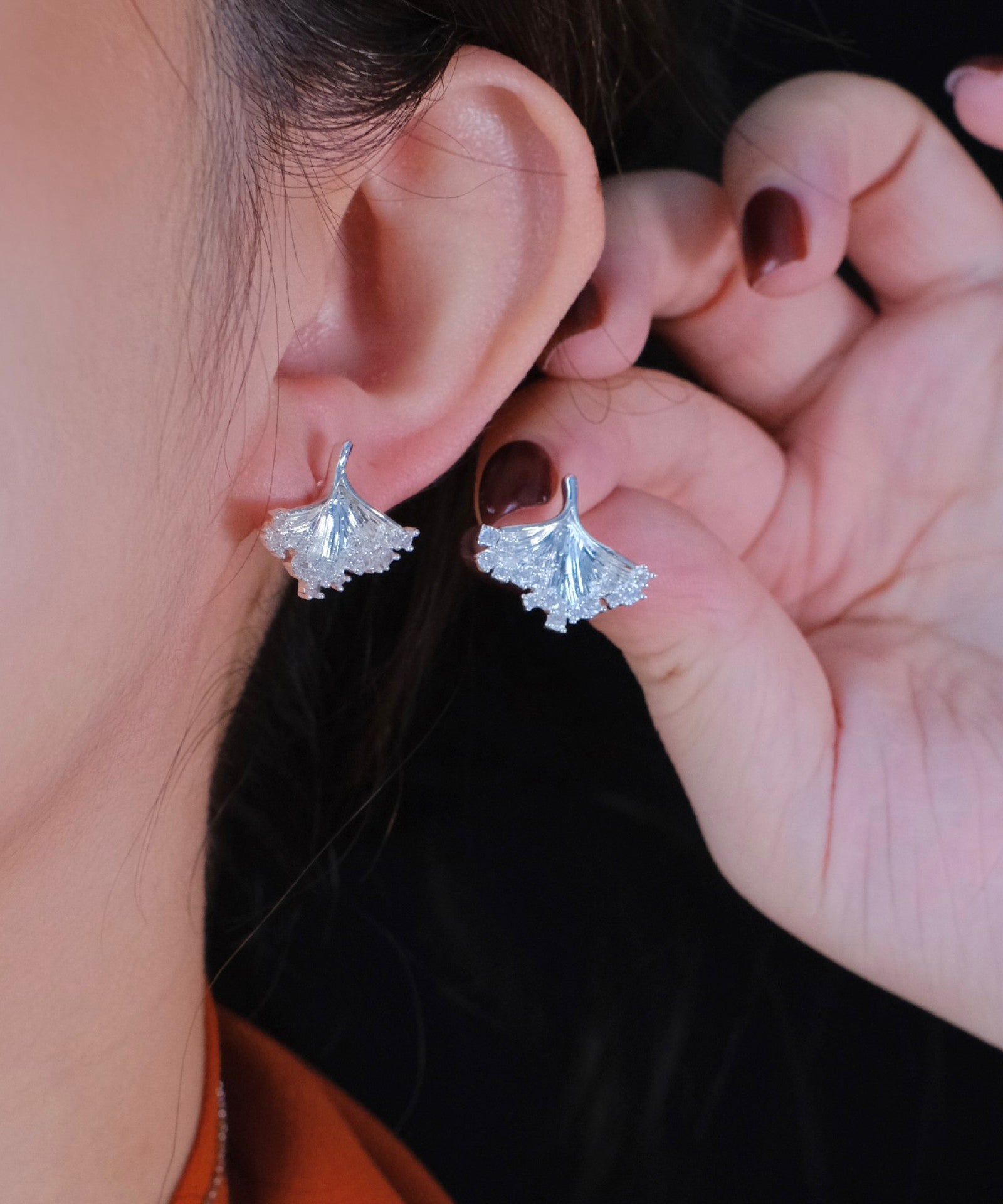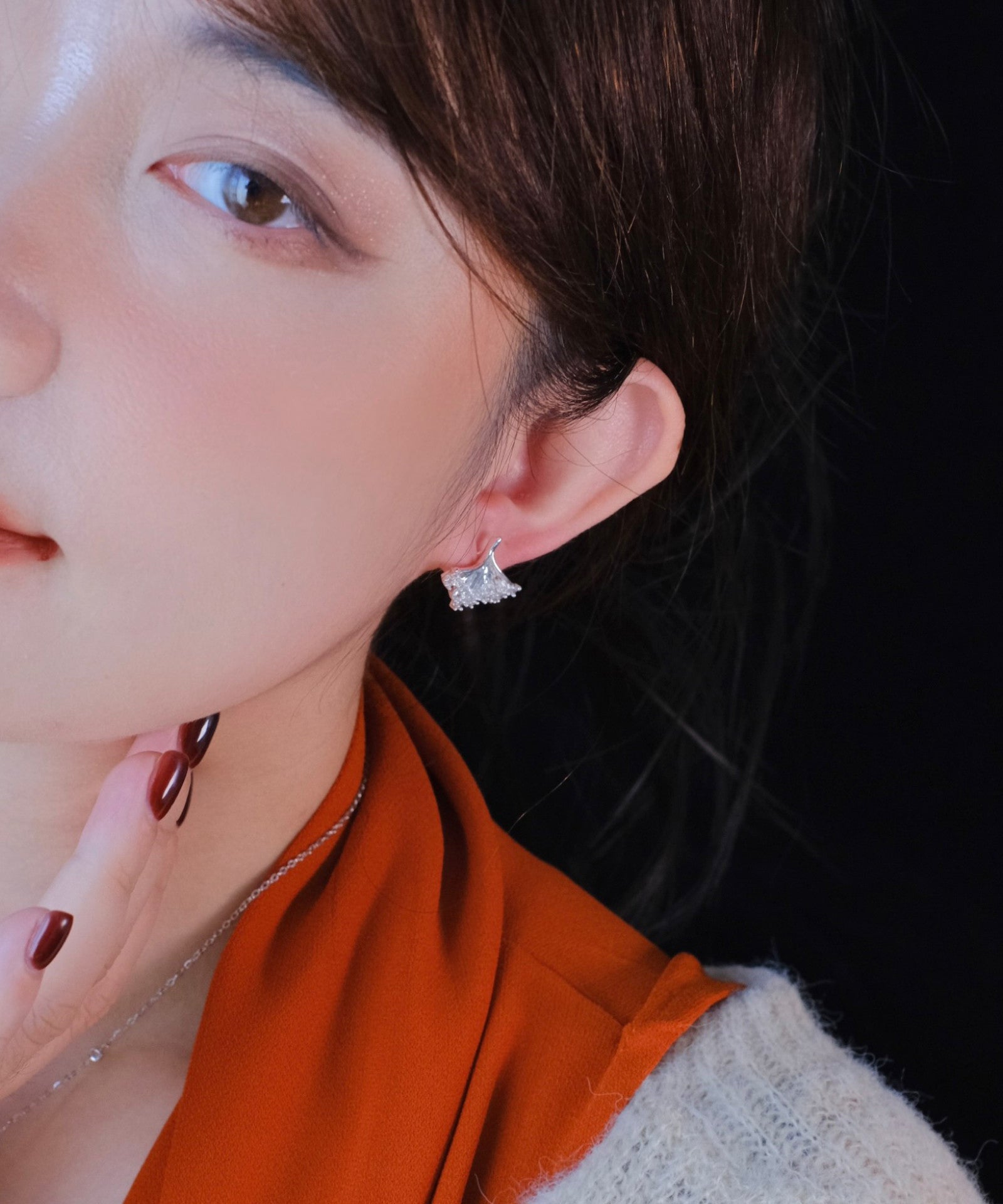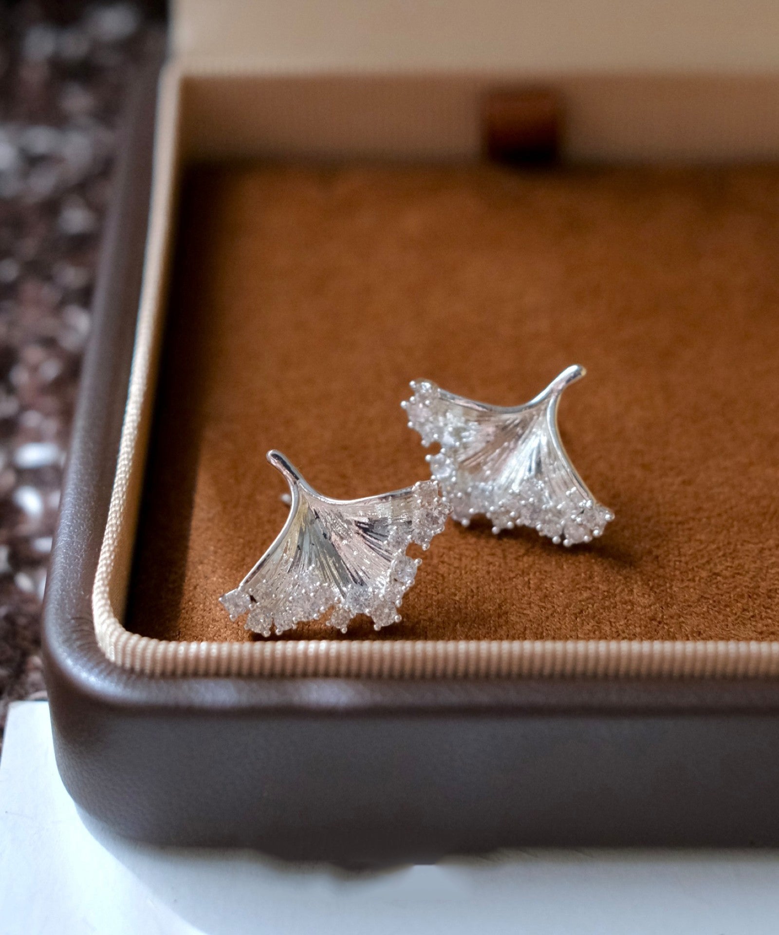 Boutique Silk Copper Silver-Plated Zircon Ginkgo Leaf Stud Earrings