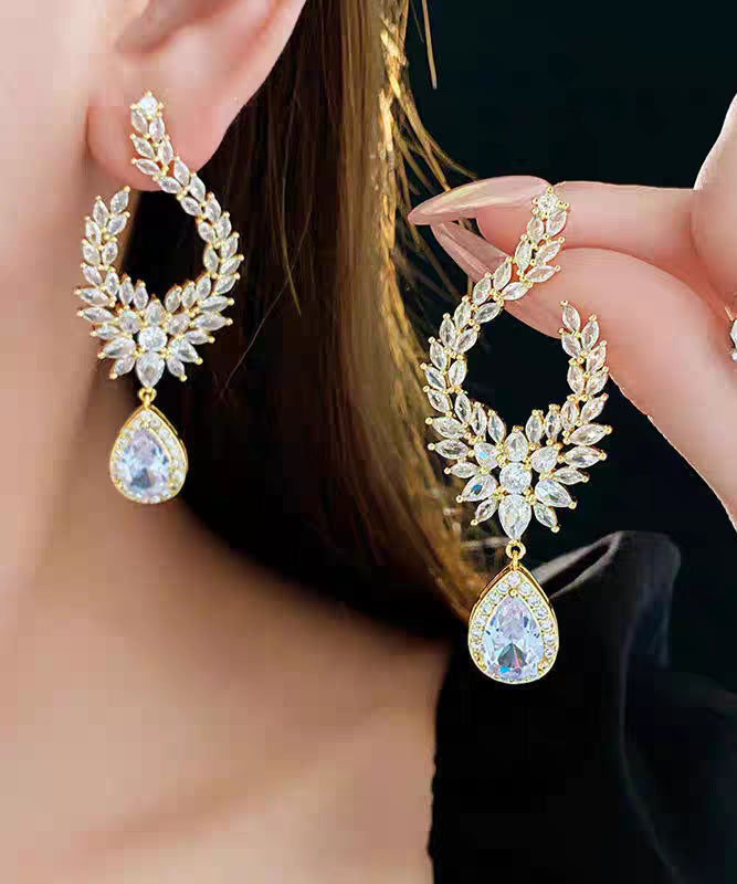 Fashion Gold Copper Overgild Zircon Leaf Water Droplet Drop Earrings