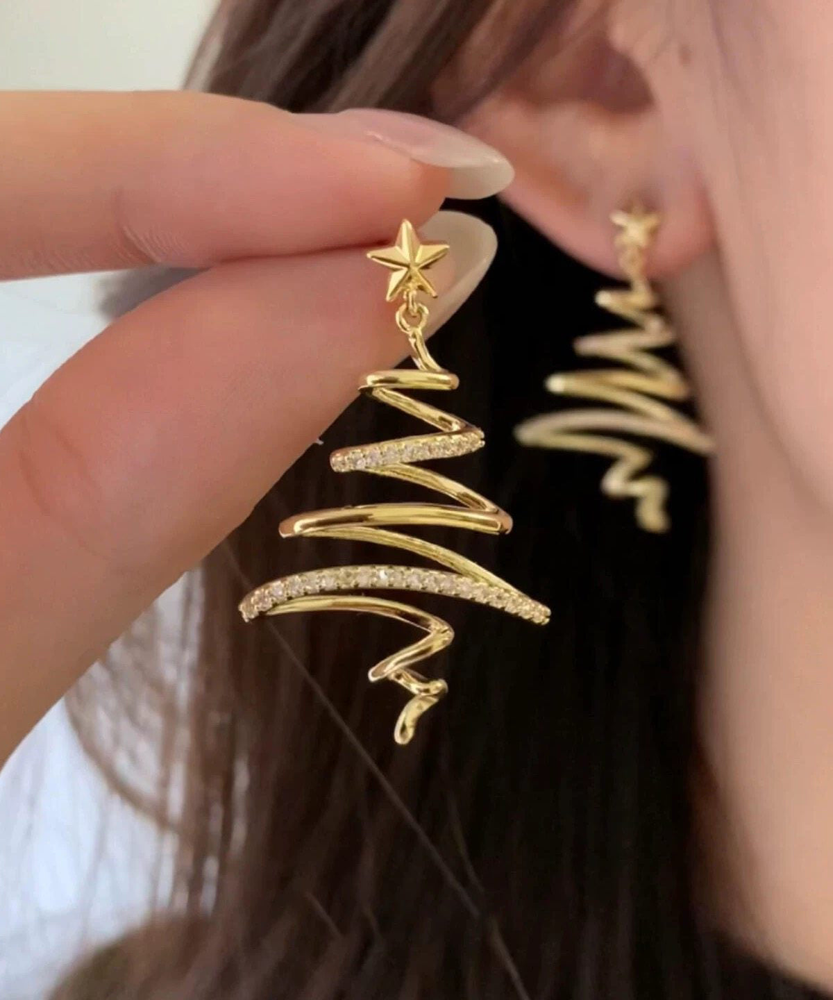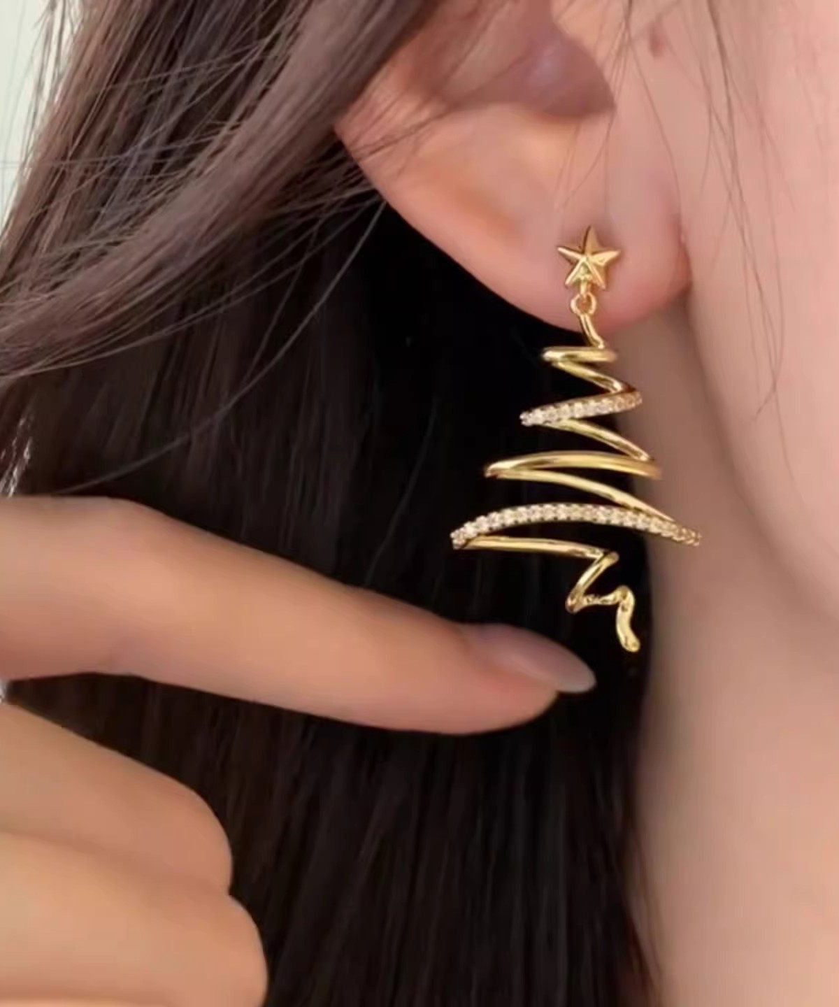 Unique Gold Copper Overgild Zircon Christmas Tree Asymmetrical Line Hoop Earrings