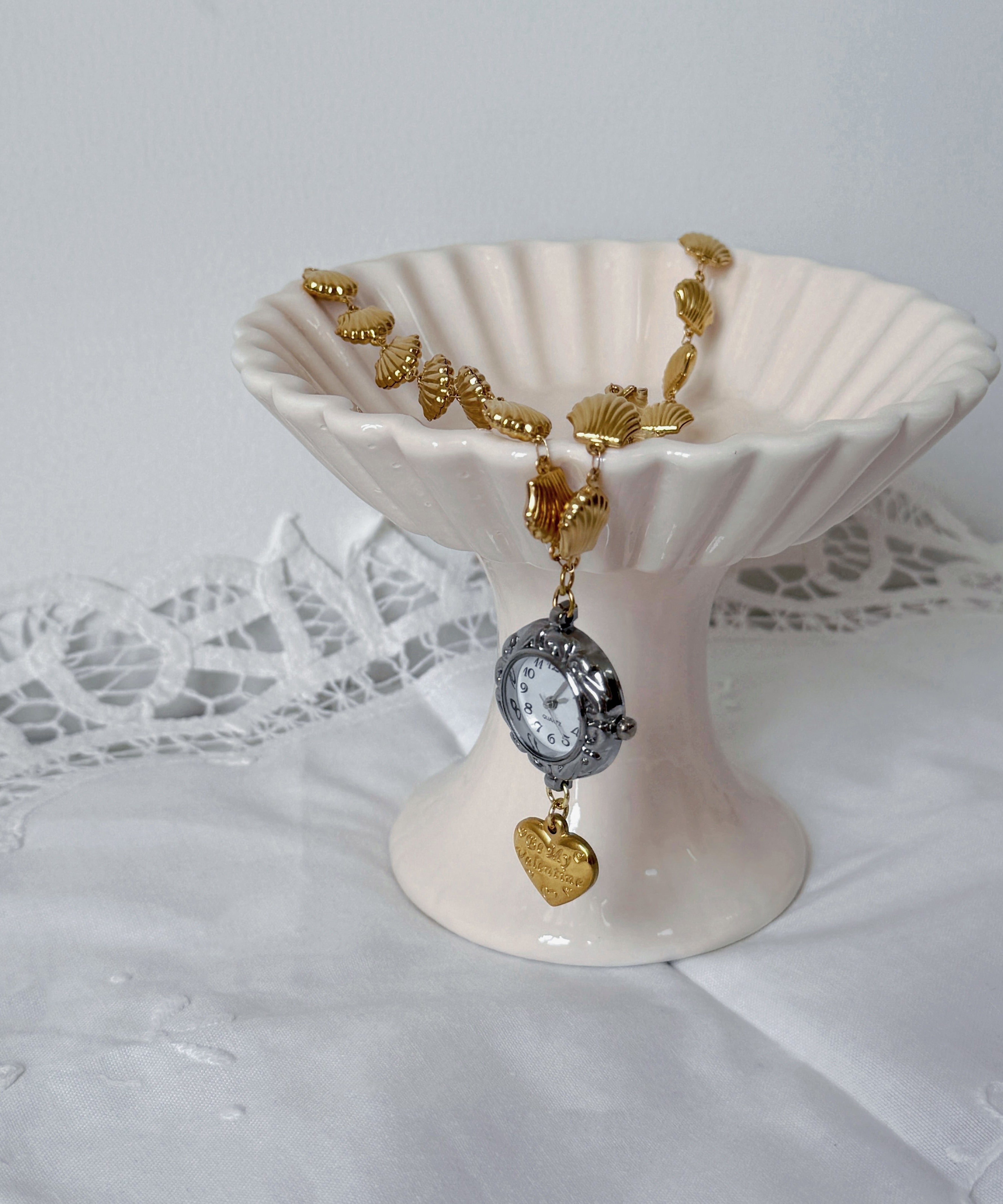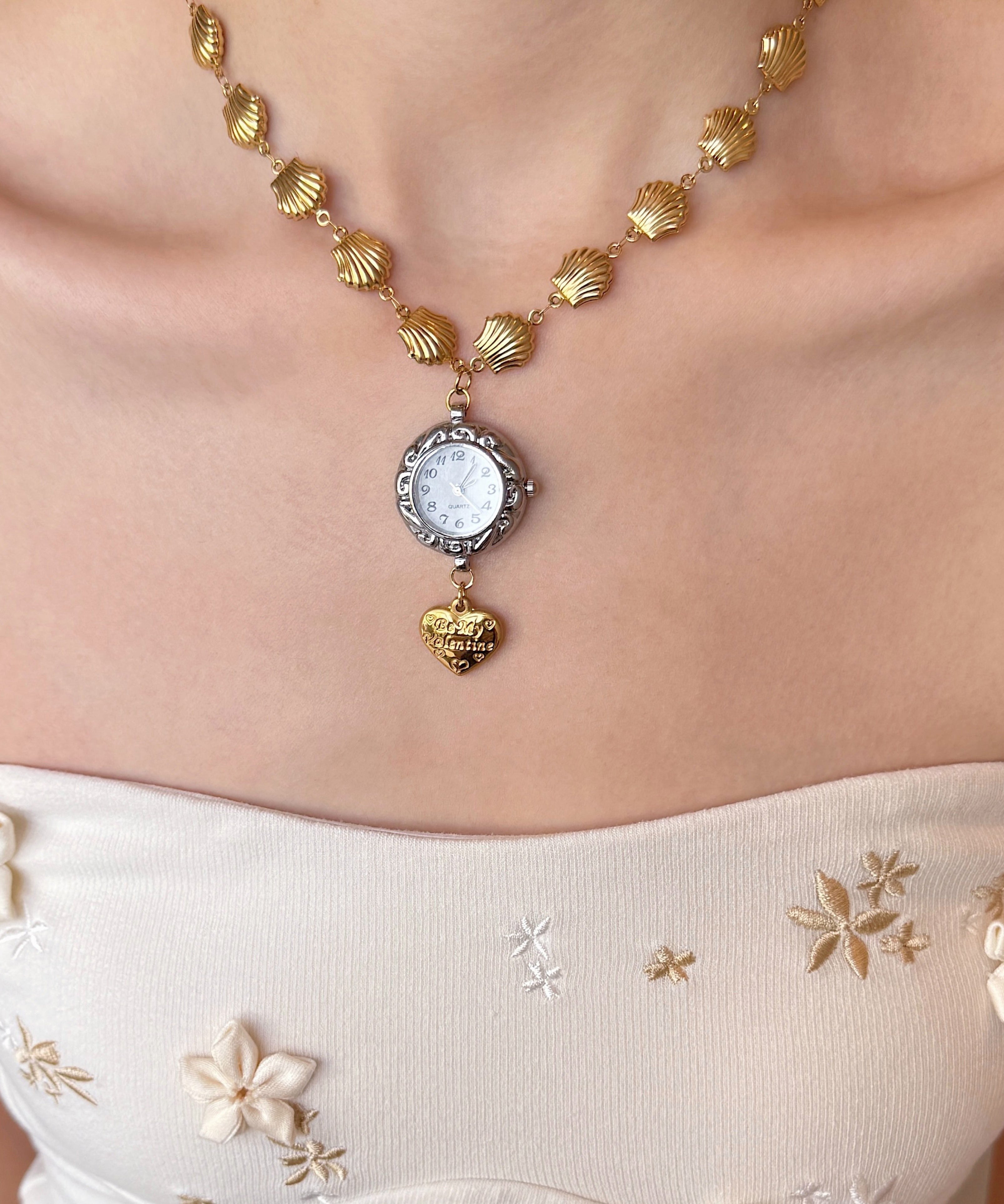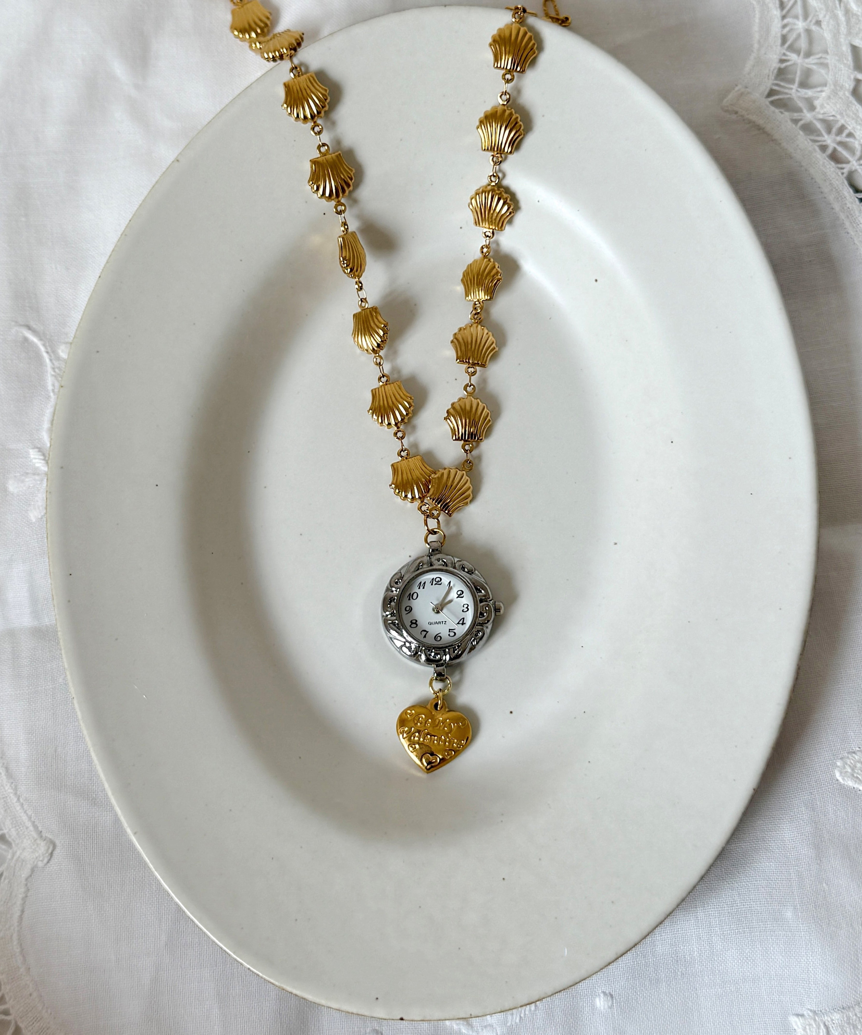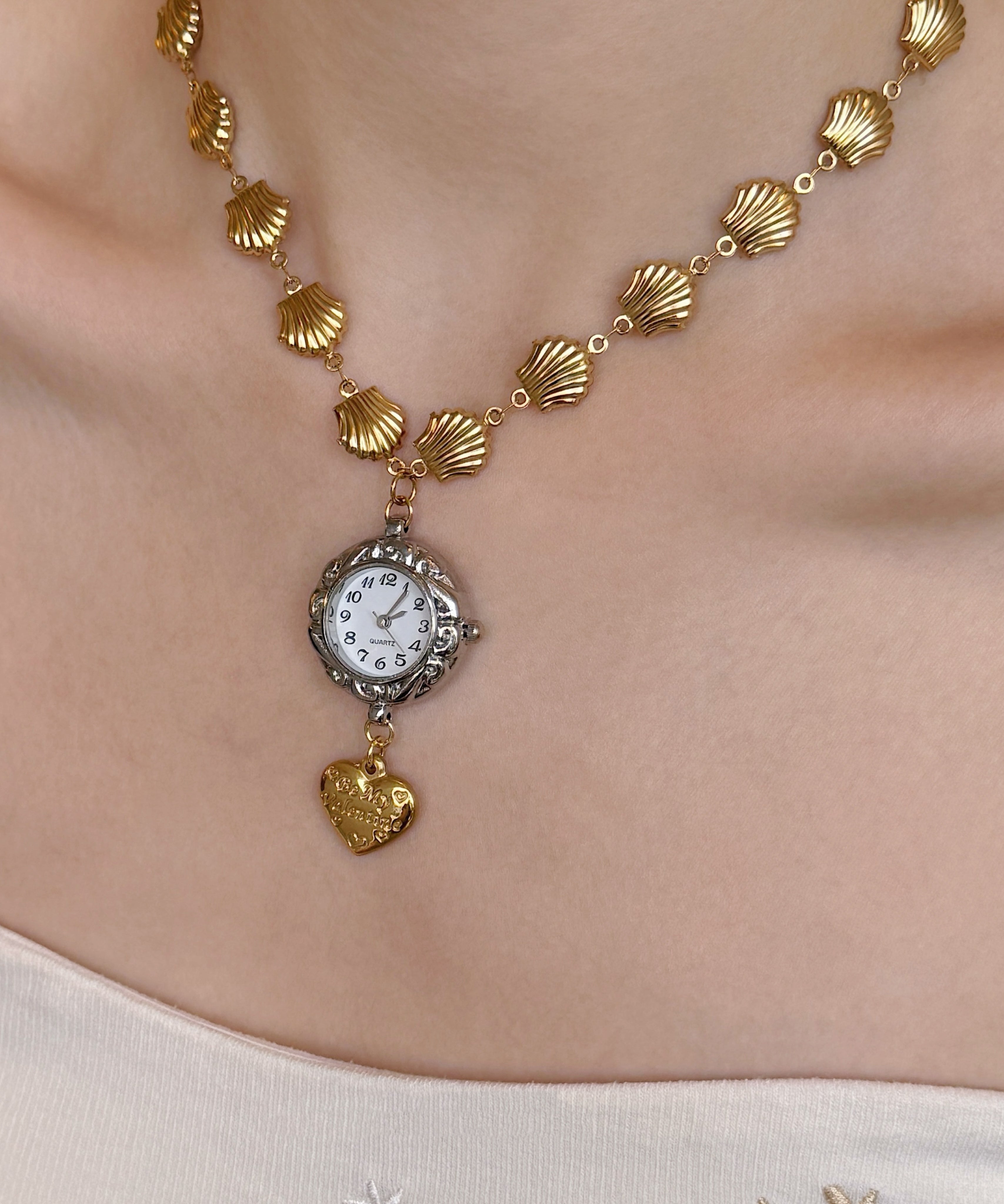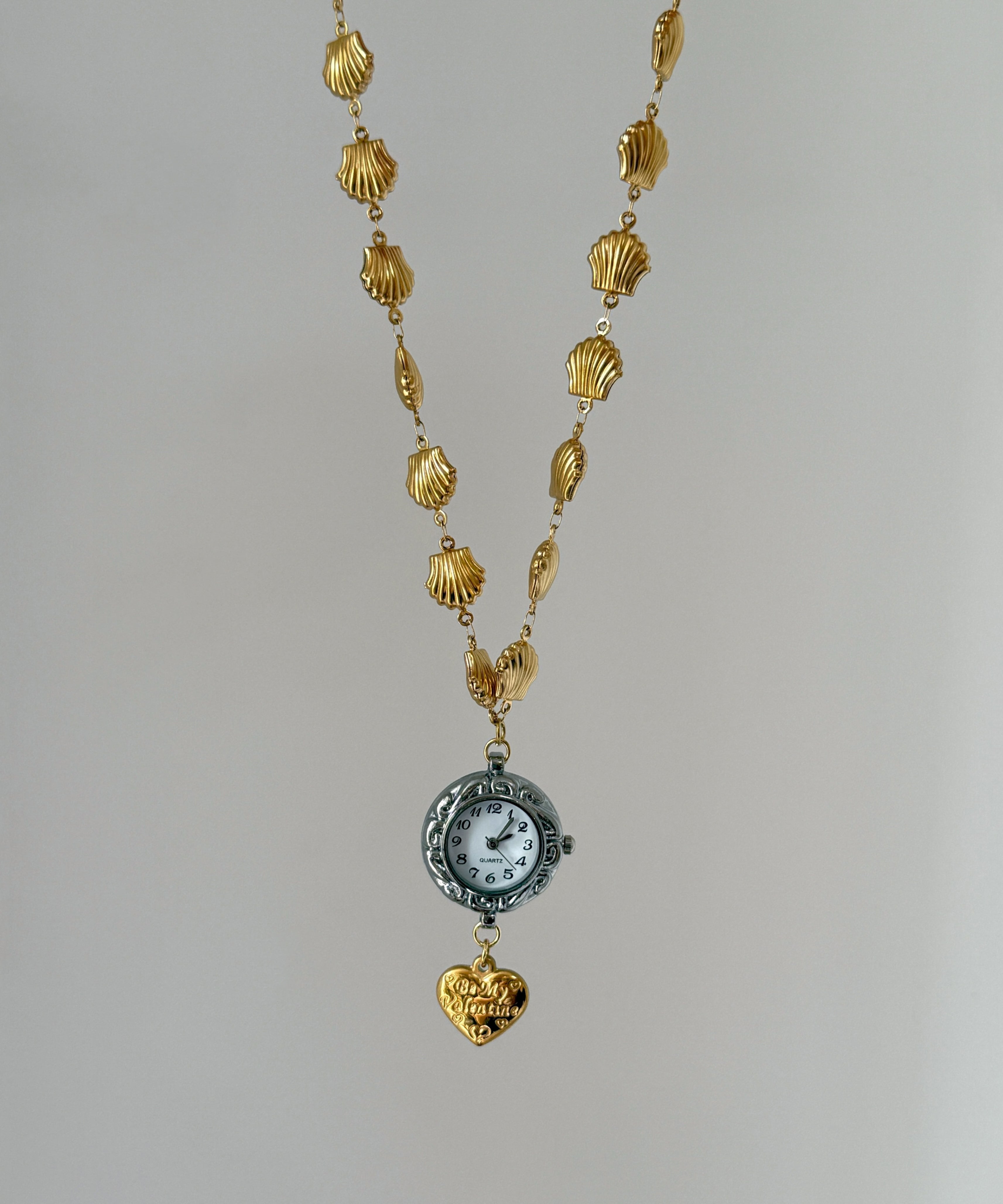 Unique Gold Stainless Steel Alloy Shell Clock Love Pendant Necklace