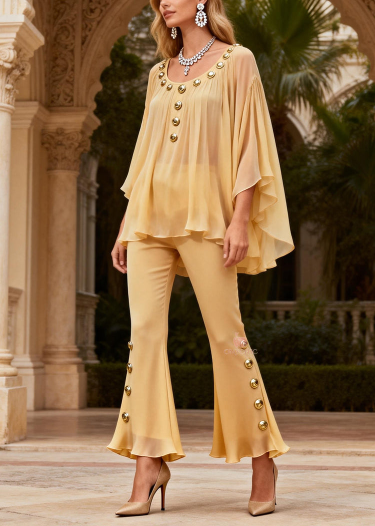 Women Yellow O Neck Sequined Silk Two-Piece Set Summer