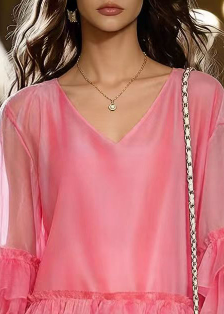 French Pink Oversized Chiffon Tea Dress Flare Sleeve