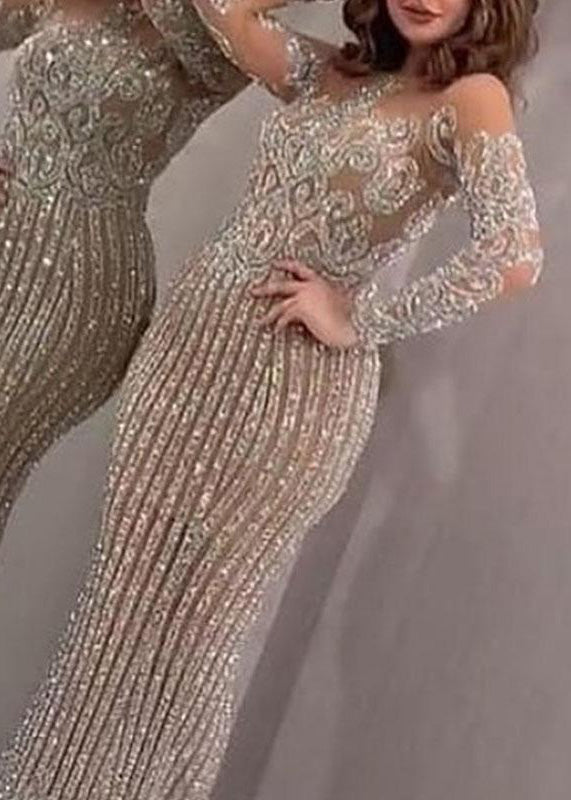 Elegant Beige O Neck Sequins Slim Fit Long Dress Spring