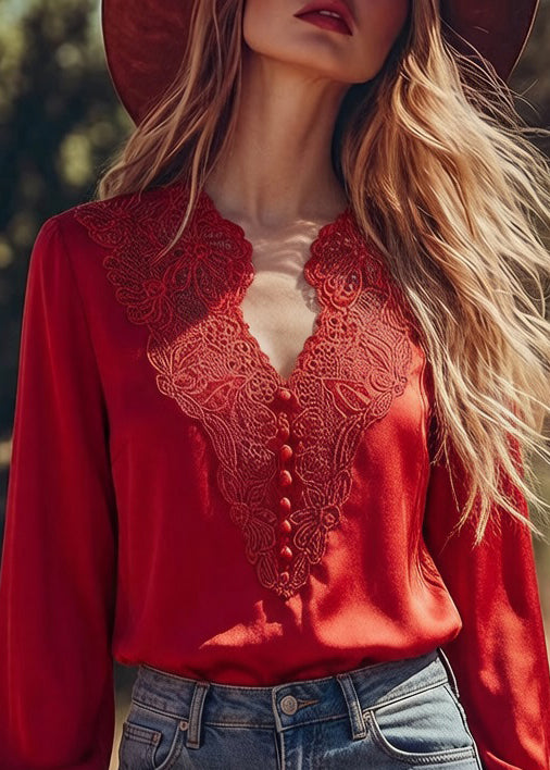 Elegant Red V Neck Button Embroideried Patchwork Silk Shirt Top Spring