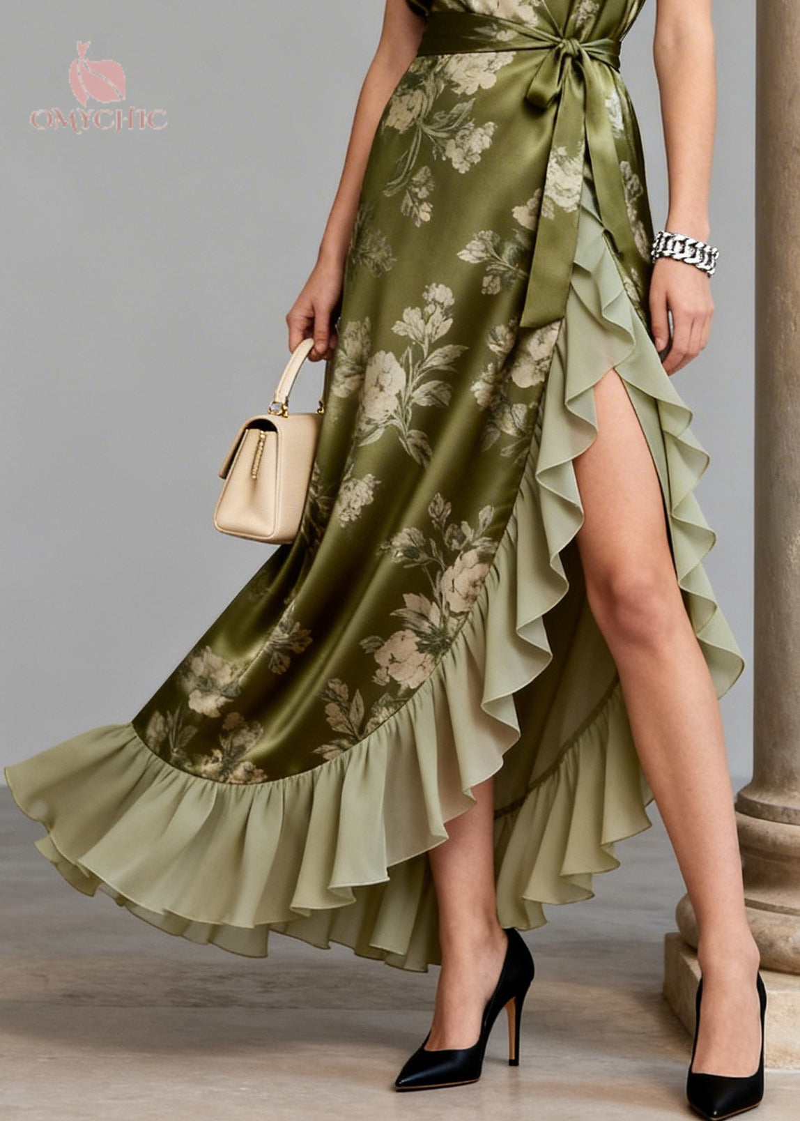 Boutique Green Ruffled Patchwork Print Chiffon Long Dresses Summer