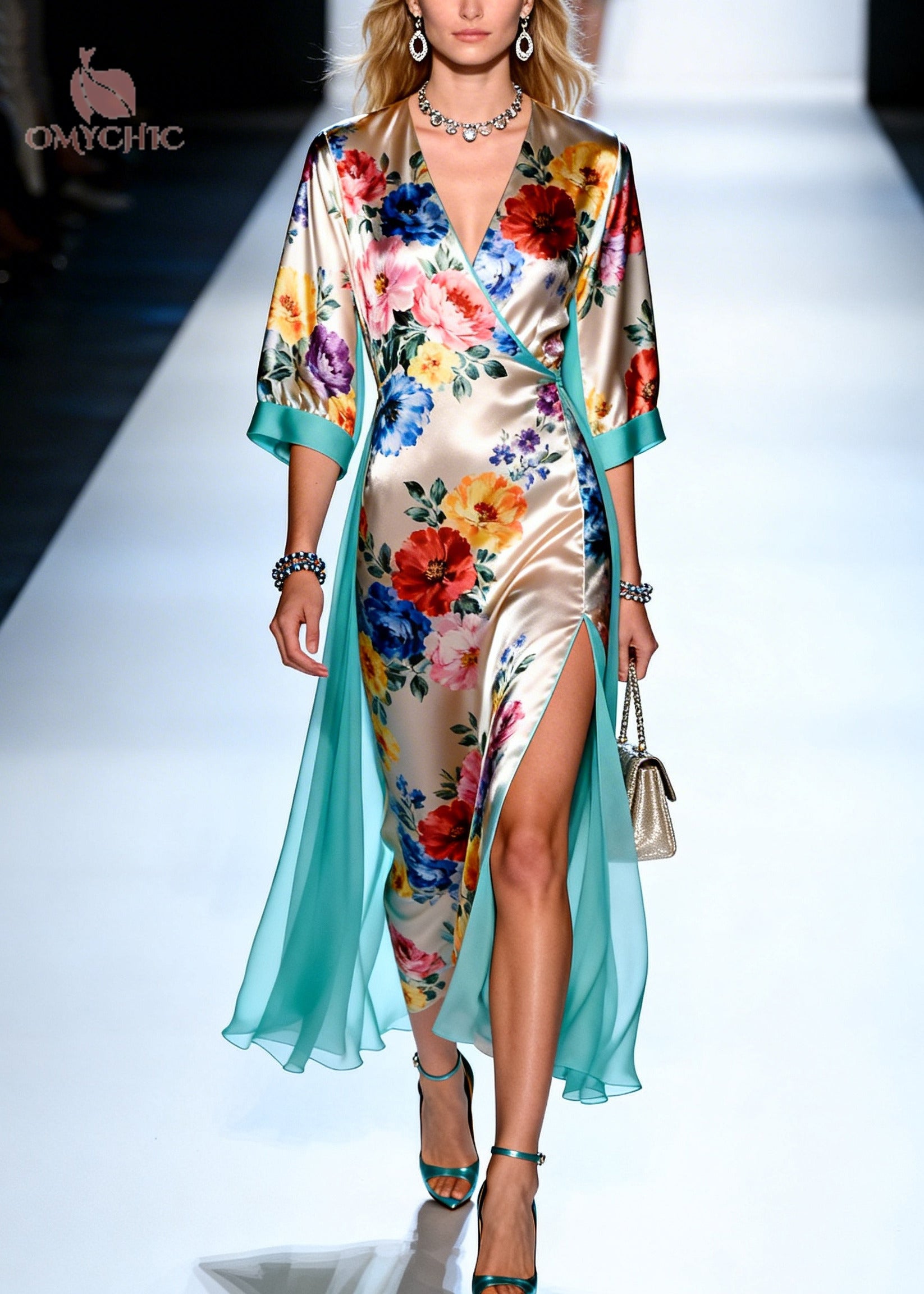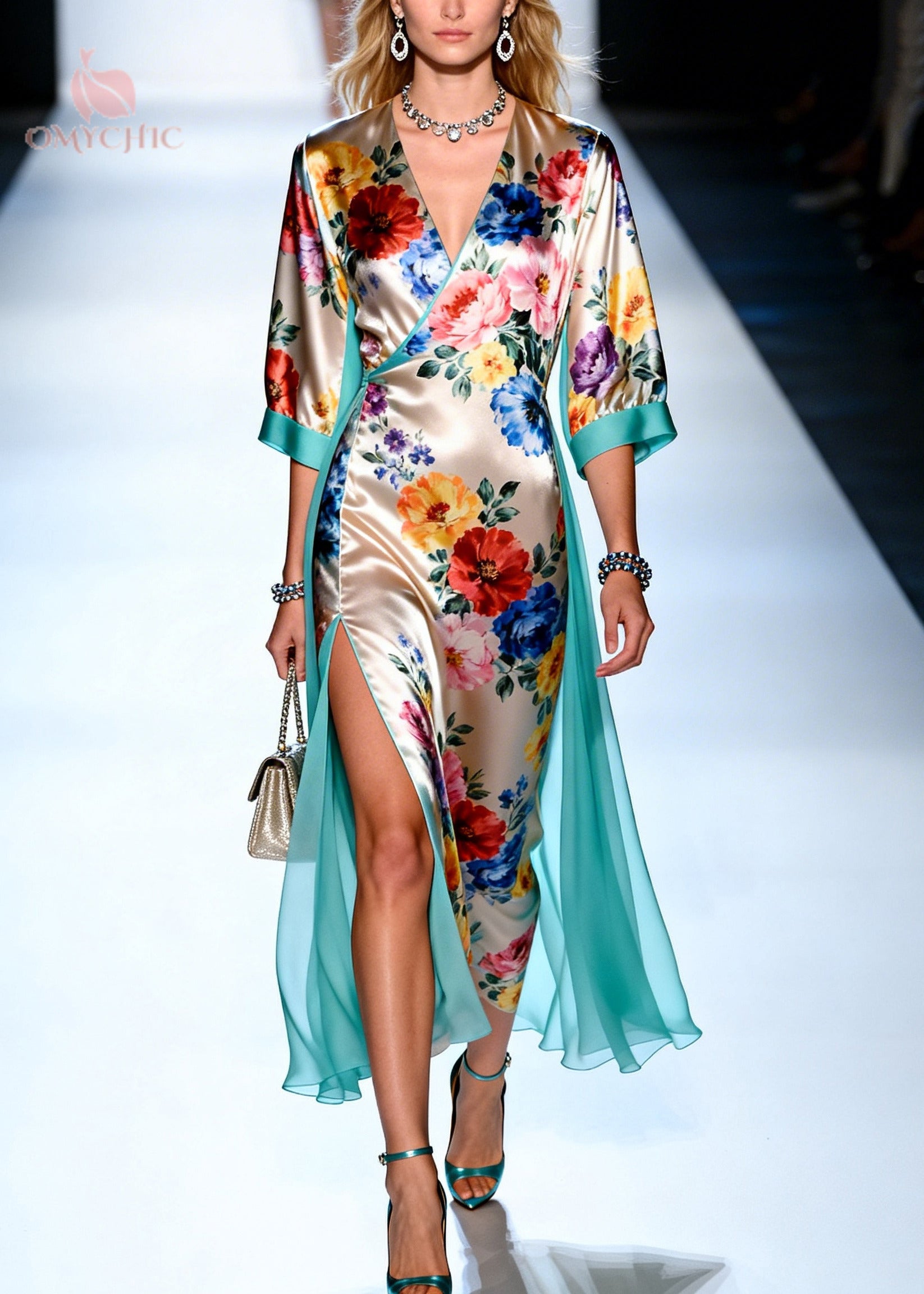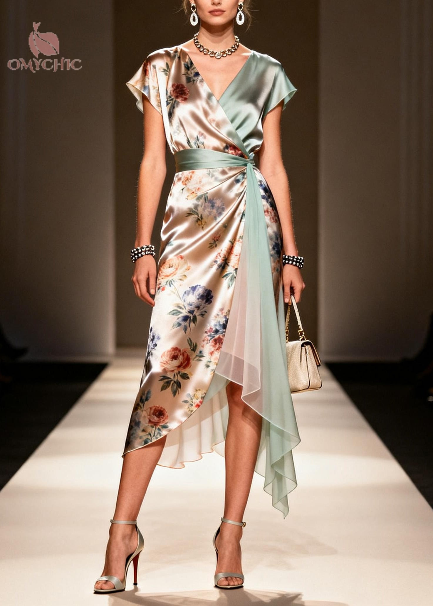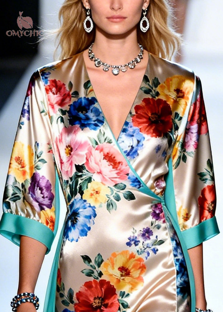 Art Grass Green V Neck Patchwork Flower Print Silk Party Dress Summer