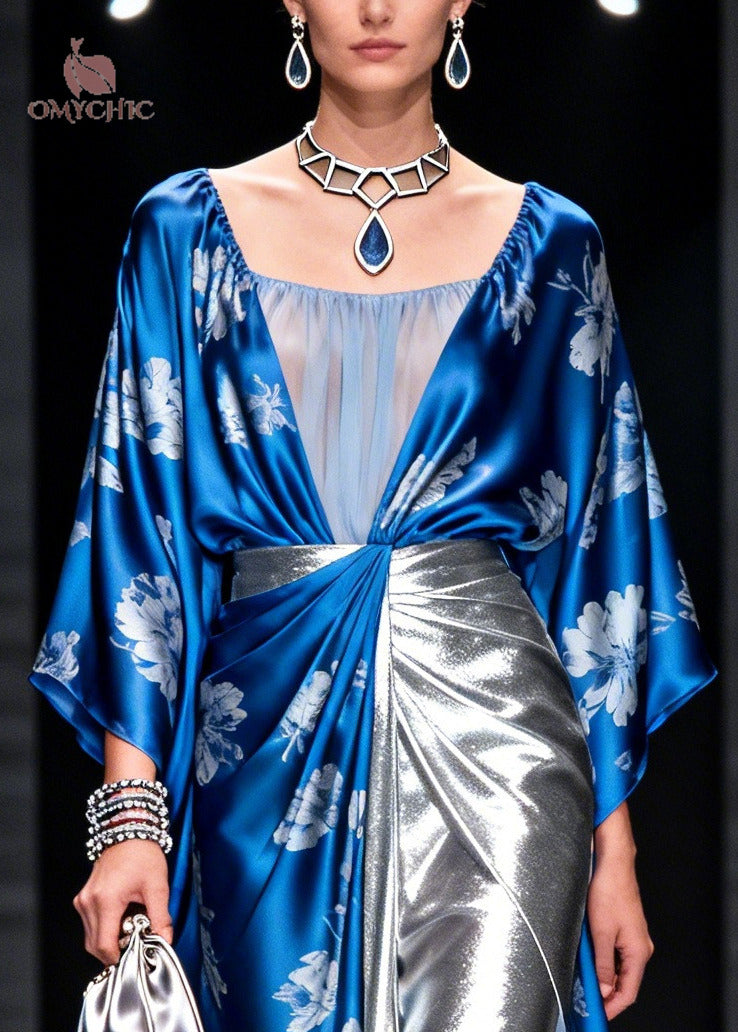 Organic Blue V Neck Patchwork Silk Cami Dresses Summer