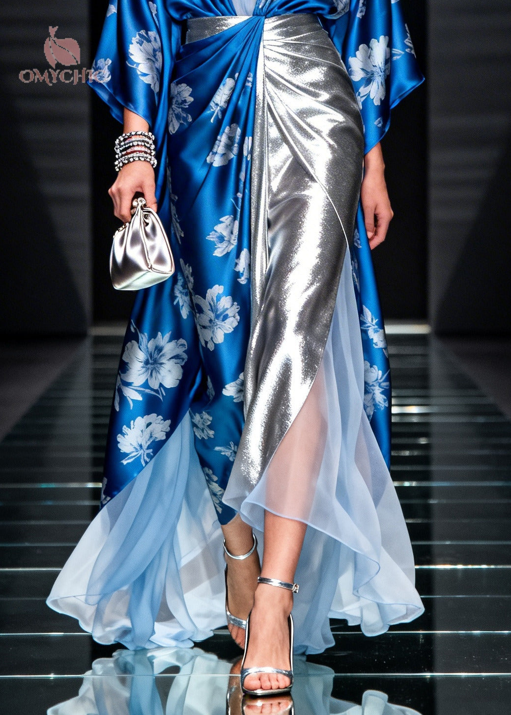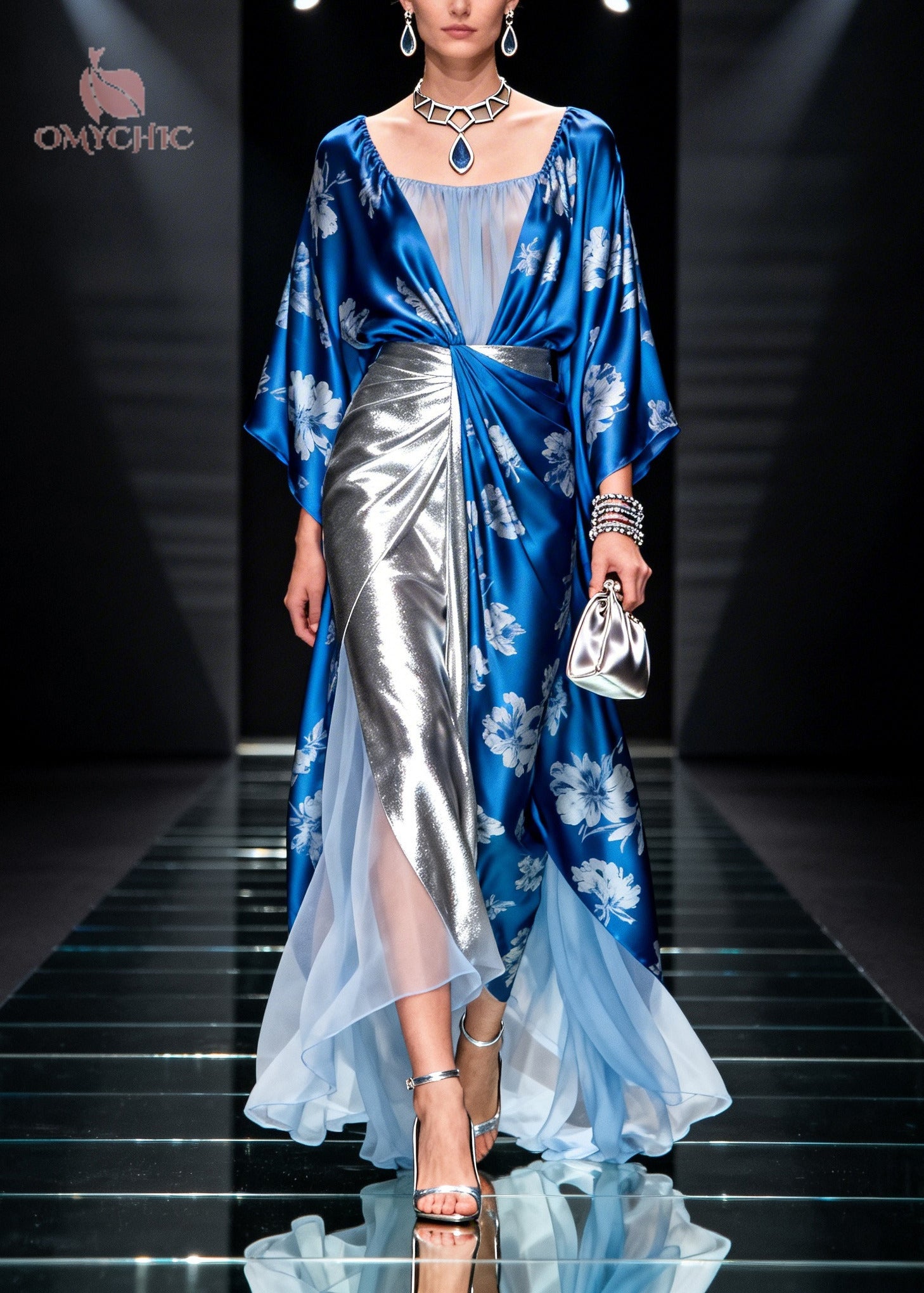 Modern Blue Jacquard Patchwork Exra Large Hem Silk Holiday Dress Summer