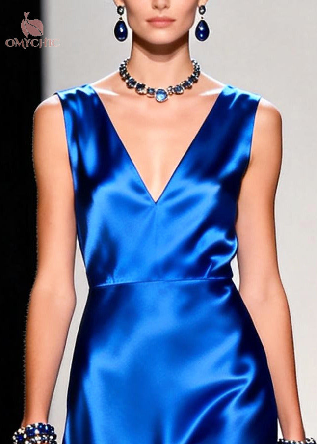 Organic Blue V Neck Patchwork Silk Cami Dresses Summer