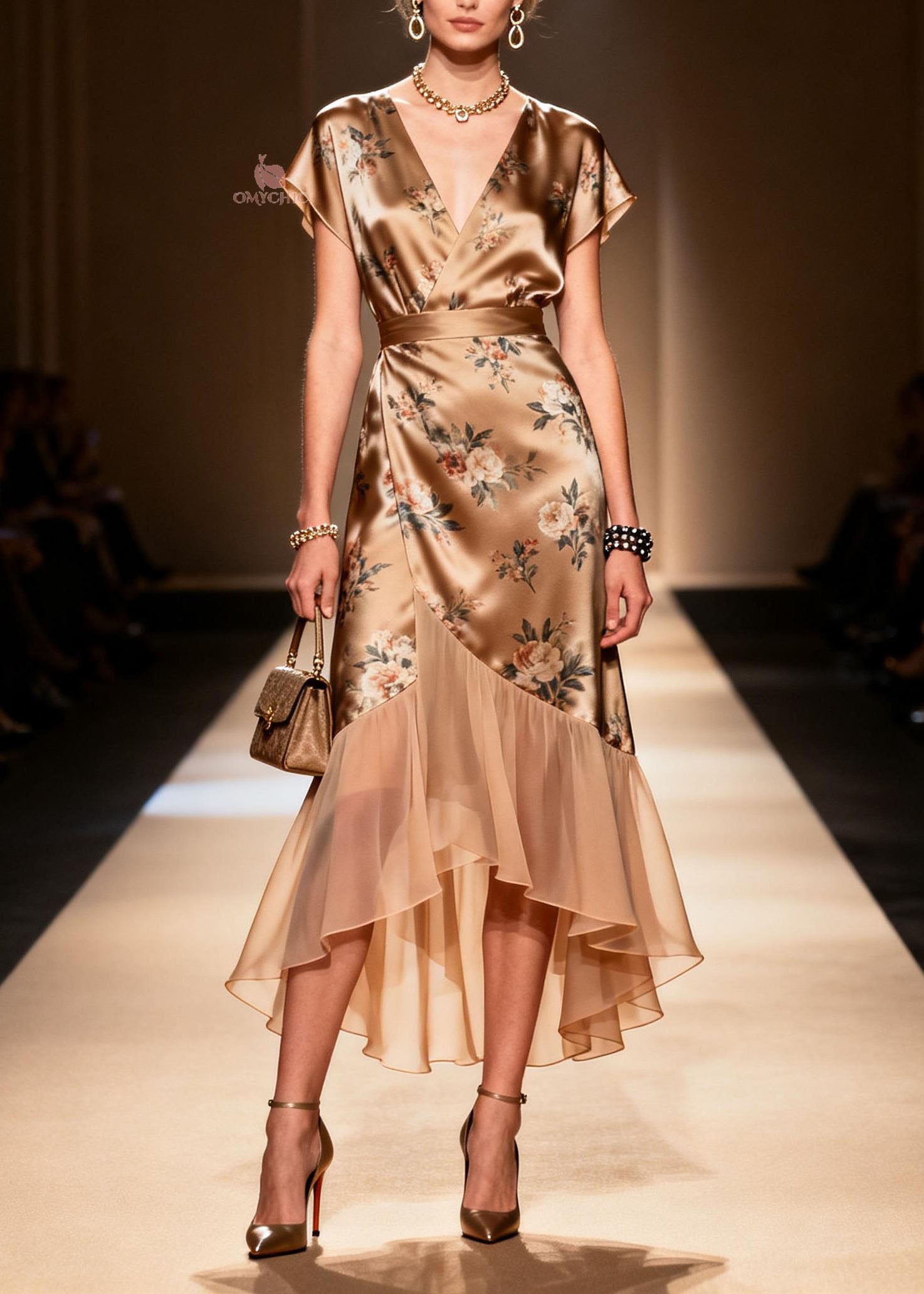 Stylish Champagne Print Patchwork Silk Maxi Dresses Summer