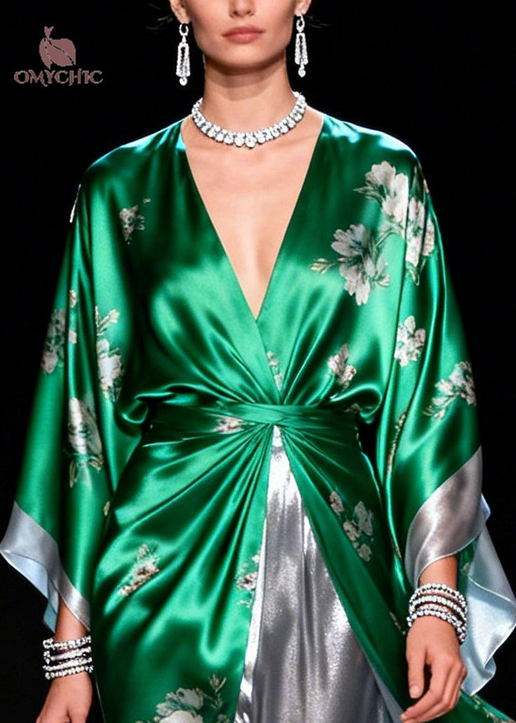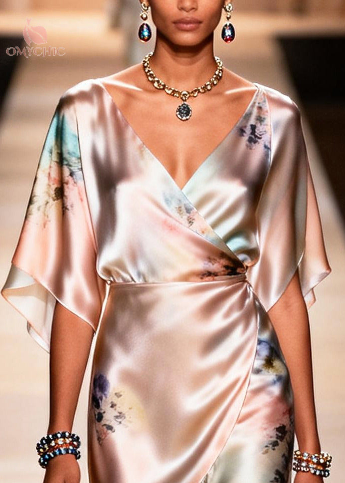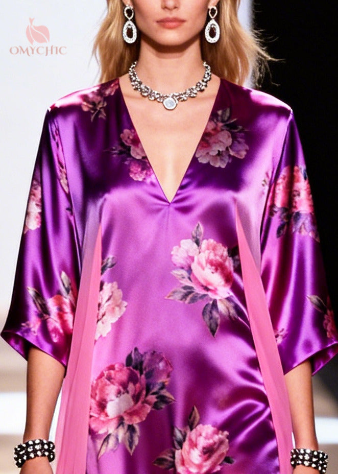 Women V Neck Print Patchwork Silk Long Dresses Summer
