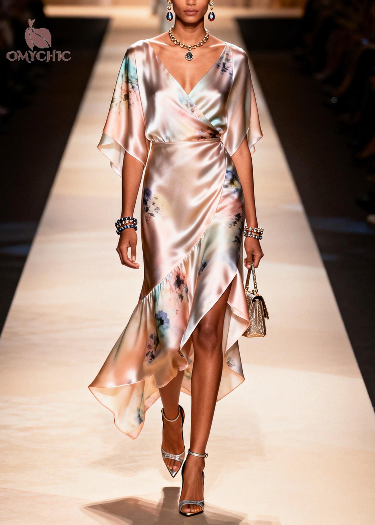 Elegant V Neck Print Ruffled Patchwork Silk Dresses Summer