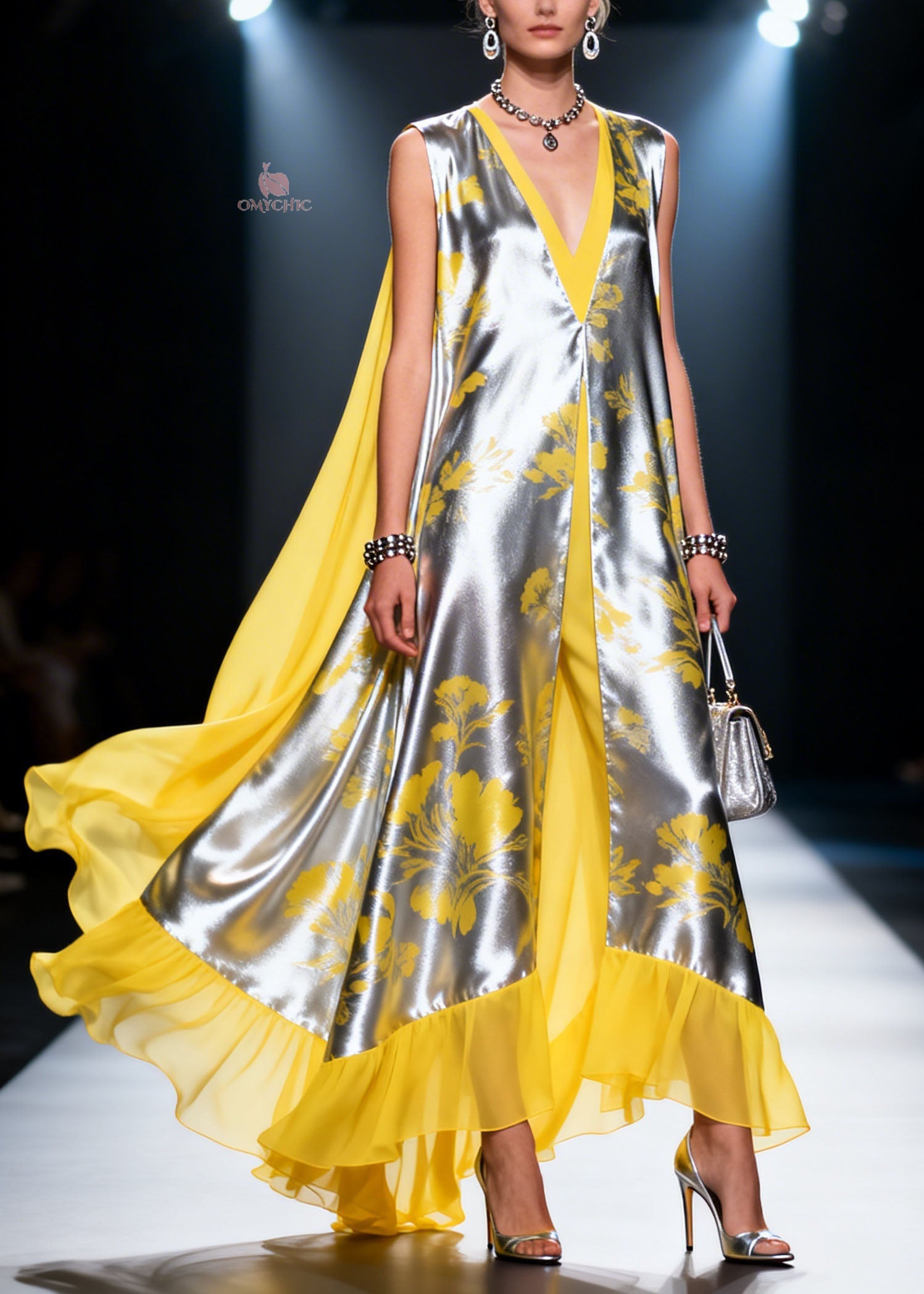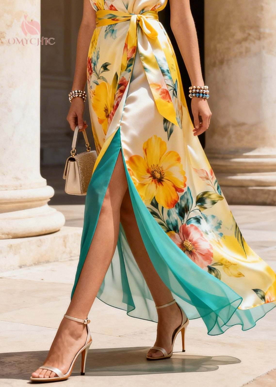 Yellow Floral Chiffon Maxi Dress Side Open Summer