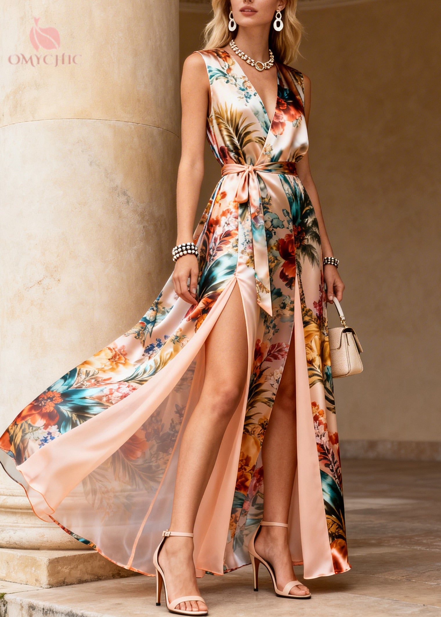 Stylish Apricot Print Side Open Chiffon Party Dress Sleeveless