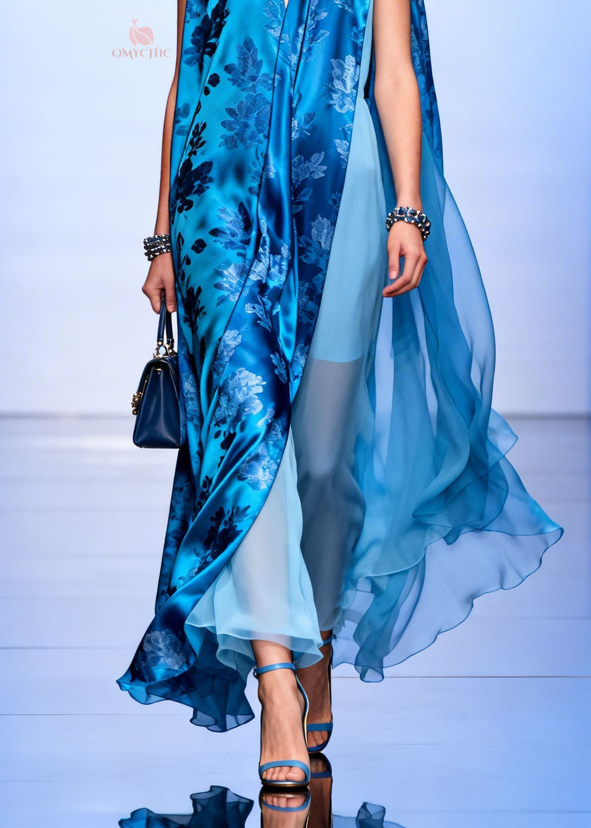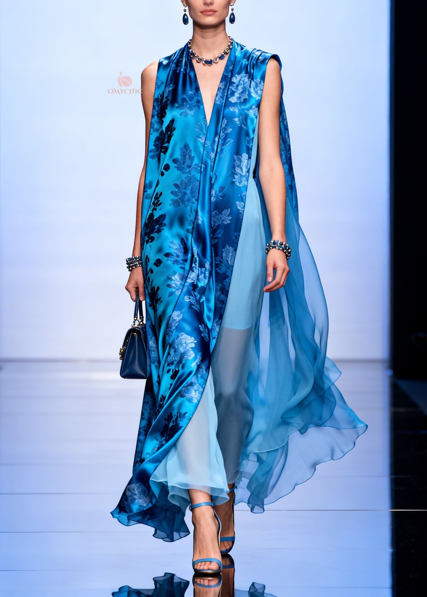 Women Blue V Neck Asymmetrical Design Print Silk Dresses Sleeveless