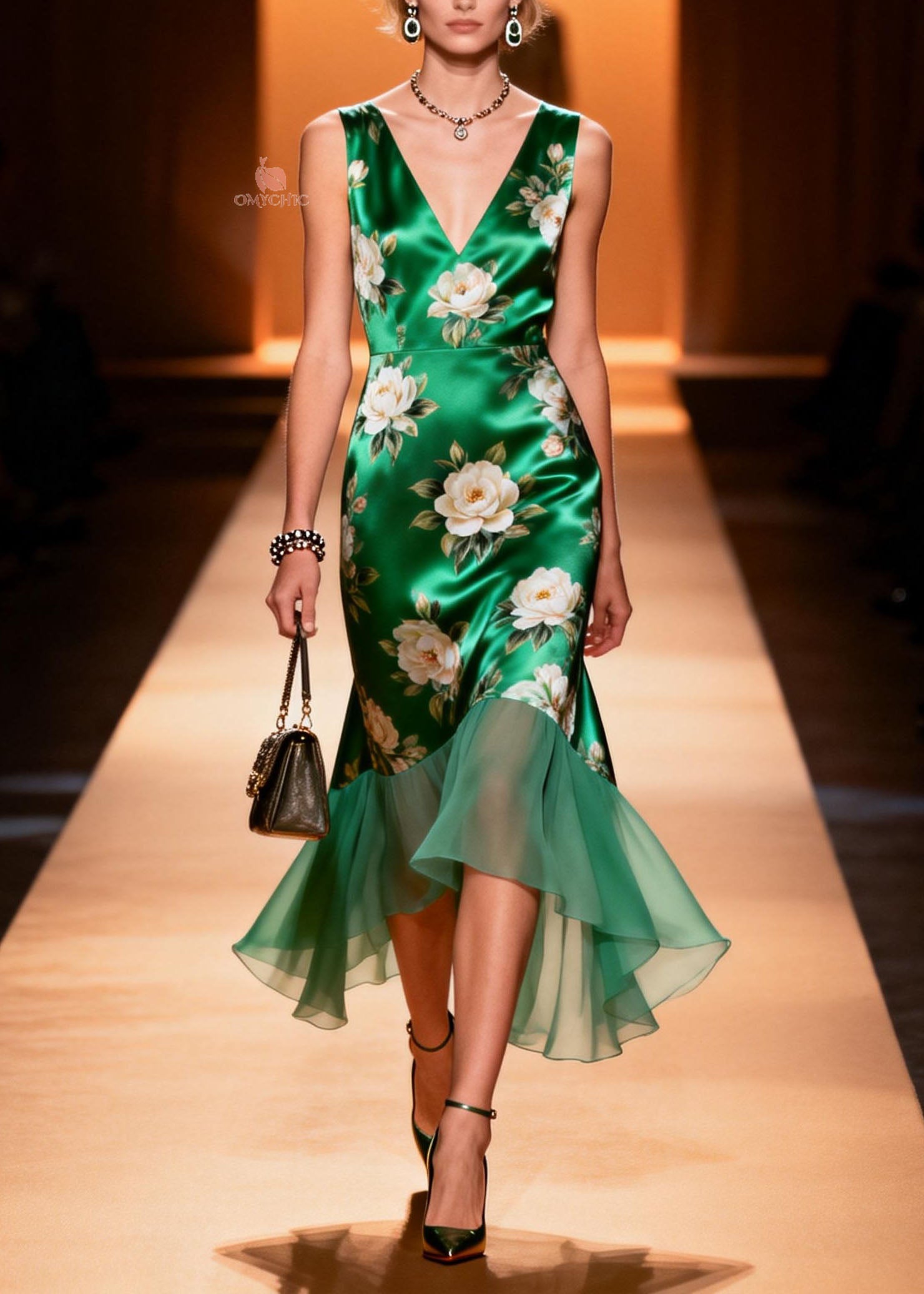 Casual Green Print Handmade Flower Chiffon Long Dress Sleeveless