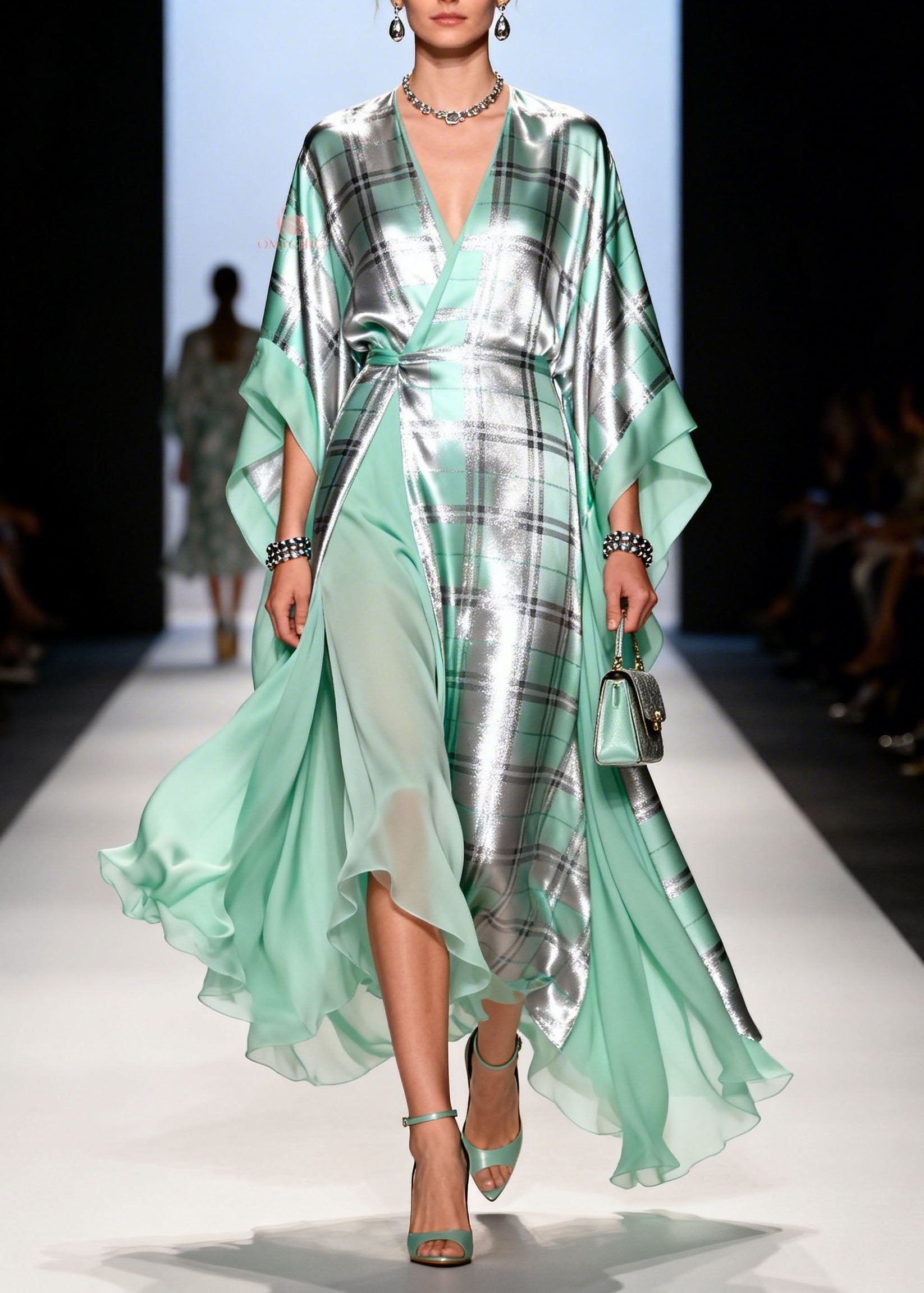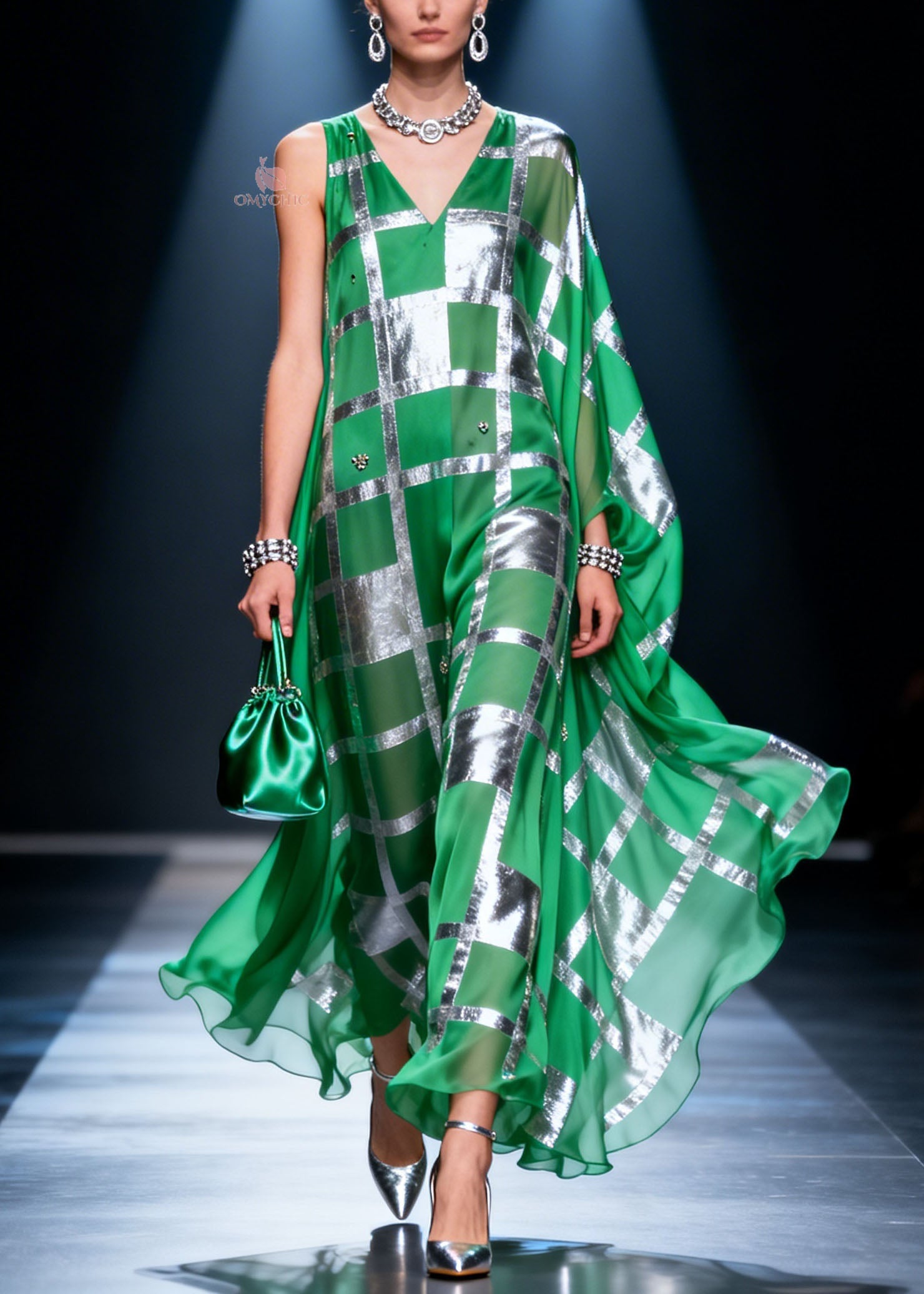 Style Green V Neck Print Side Open Silk Dress Sleeveless