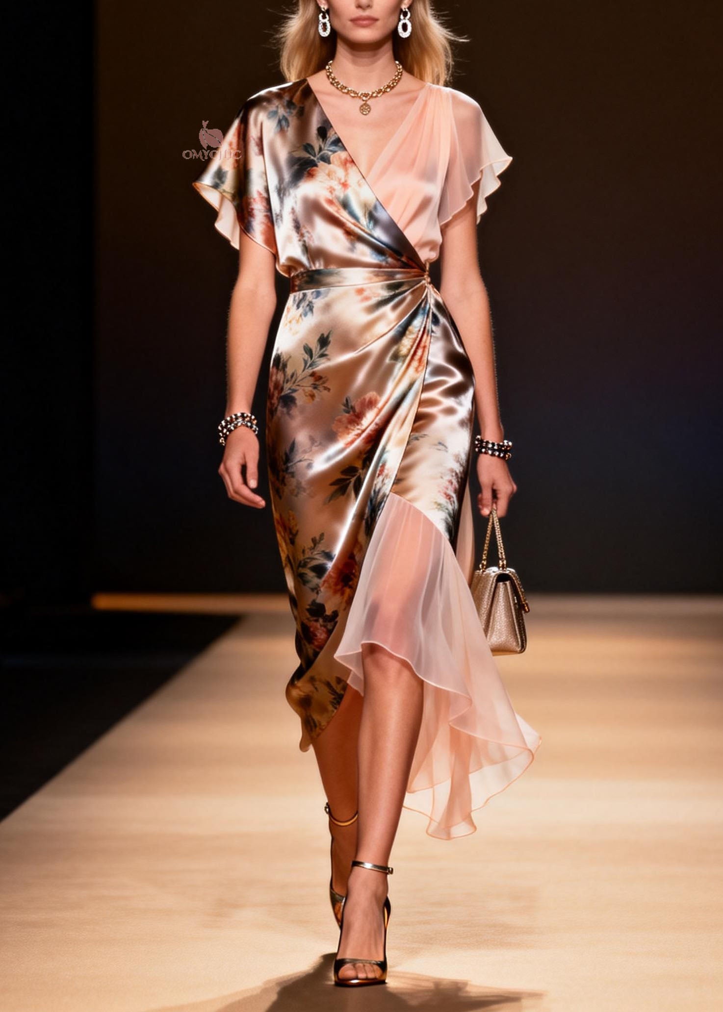 Italian V Neck Print Asymmetrical Design Silk Dress Summer