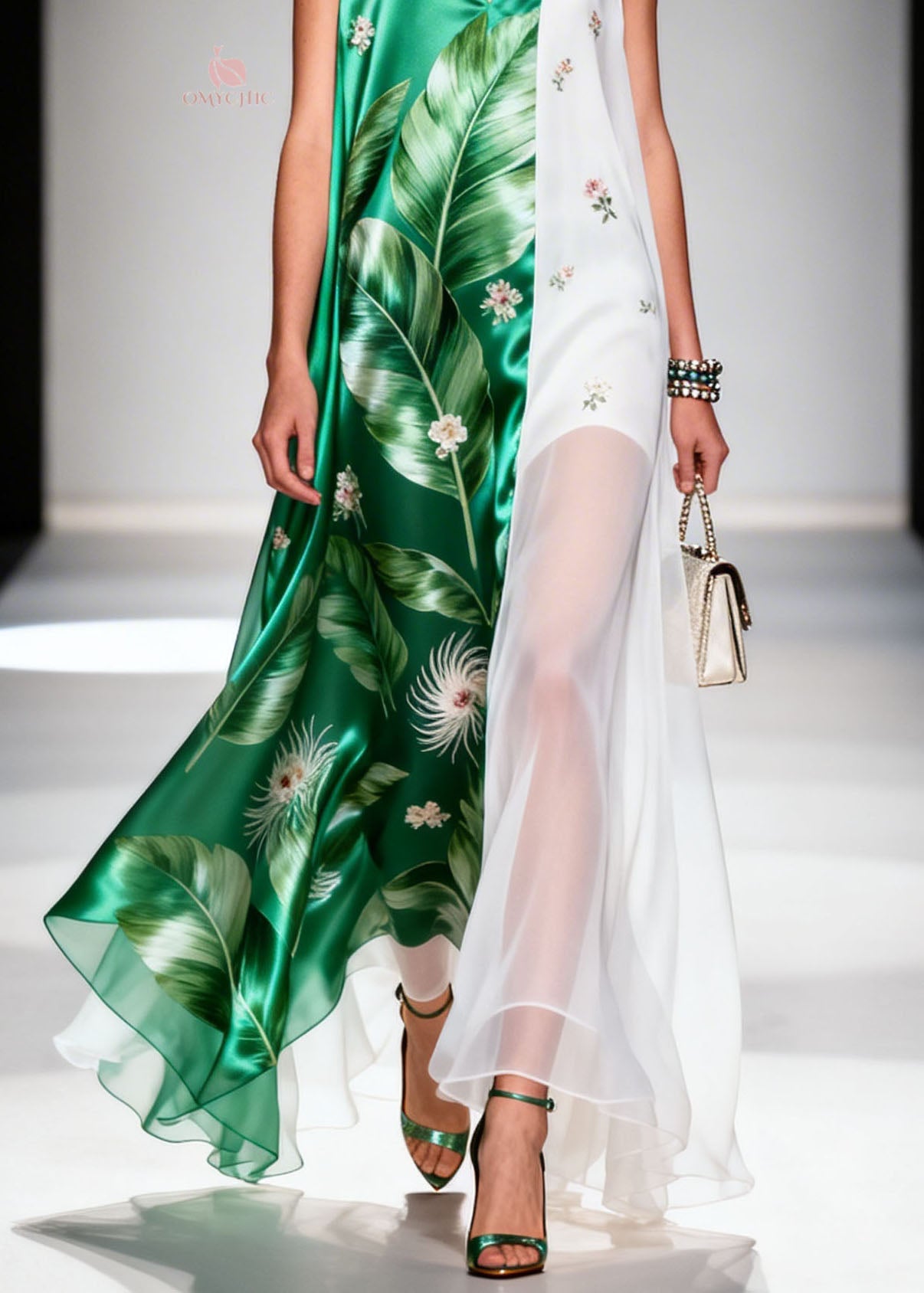 Unique Green V Neck Asymmetrical Design Print Chiffon Maxi Dresses Summer