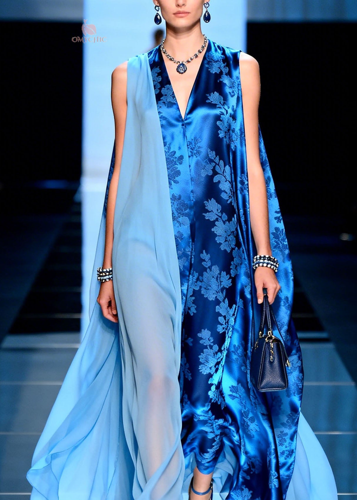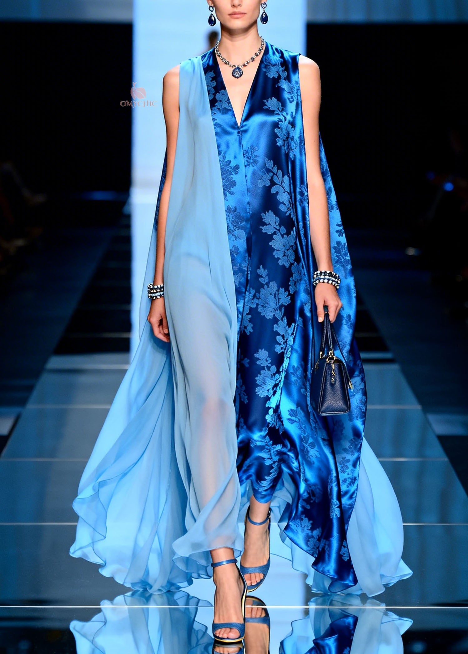 Modern V Neck Print Patchwork Silk Long Dresses Sleeveless