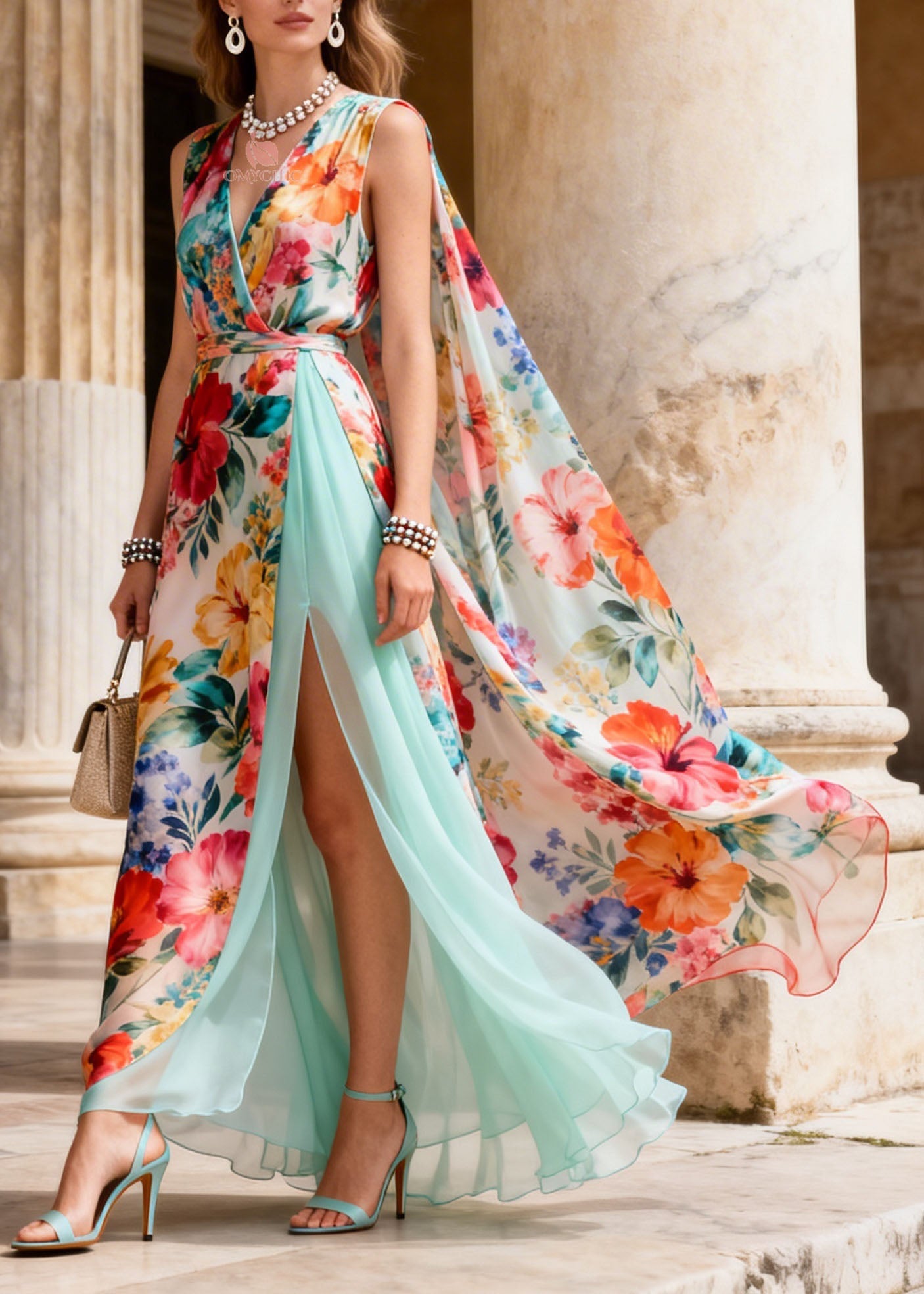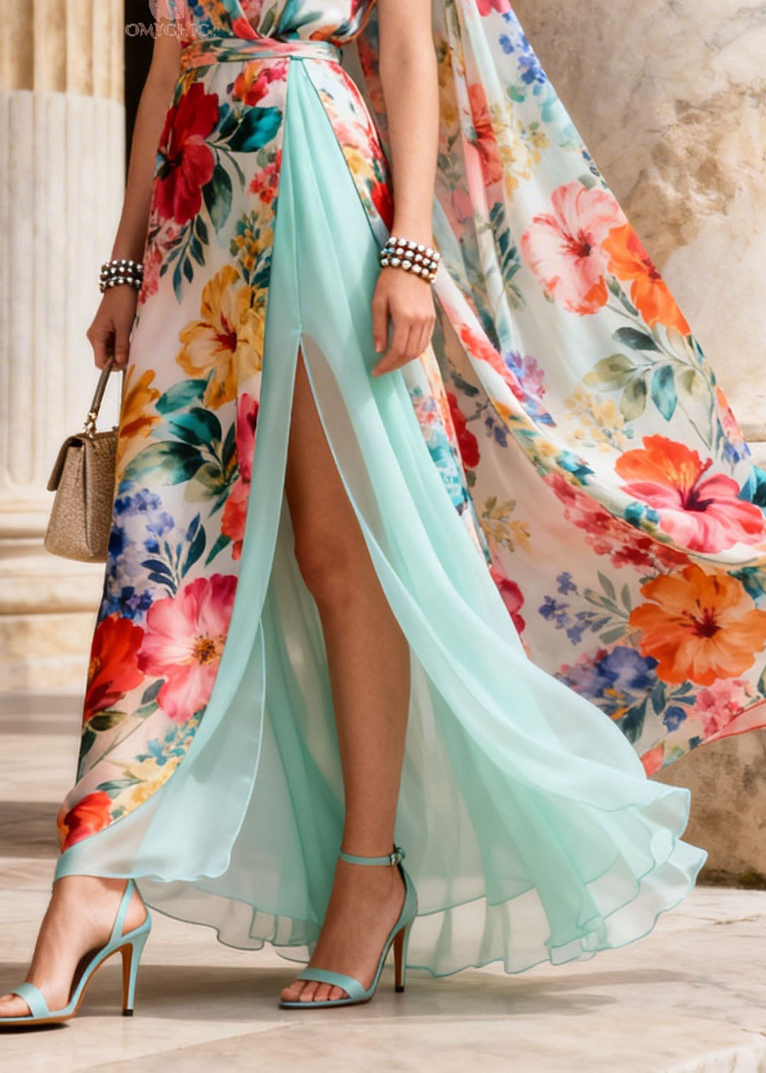 French V Neck Print Side Open Patchwork Chiffon Dresses Summer