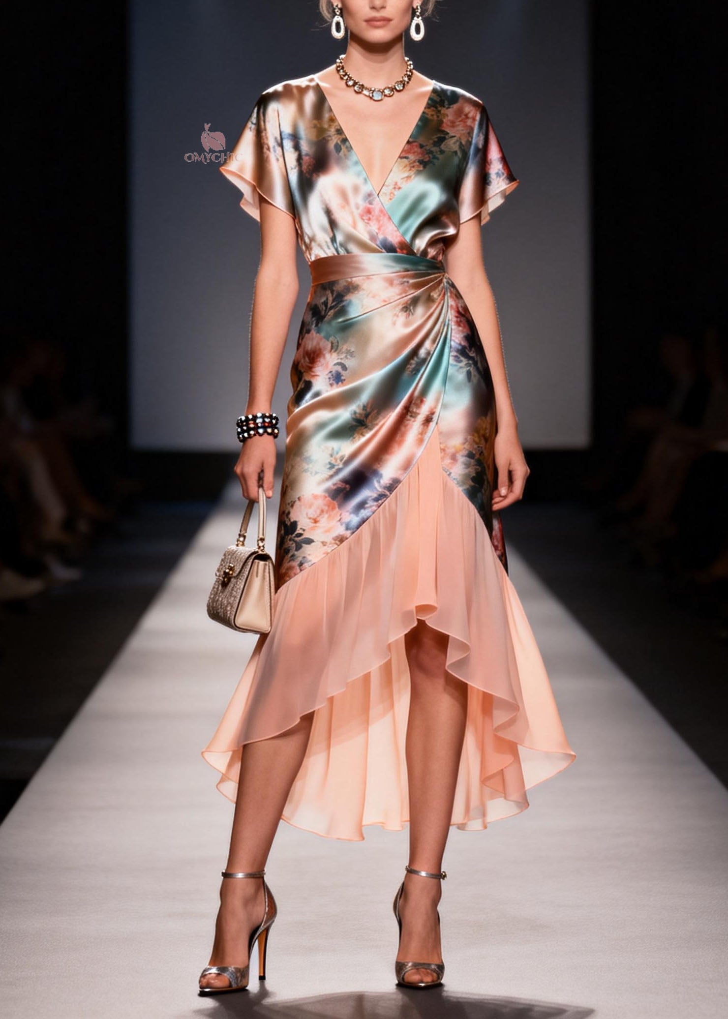 Women V Neck Ruffled Print Patchwork Silk Dresses Summer