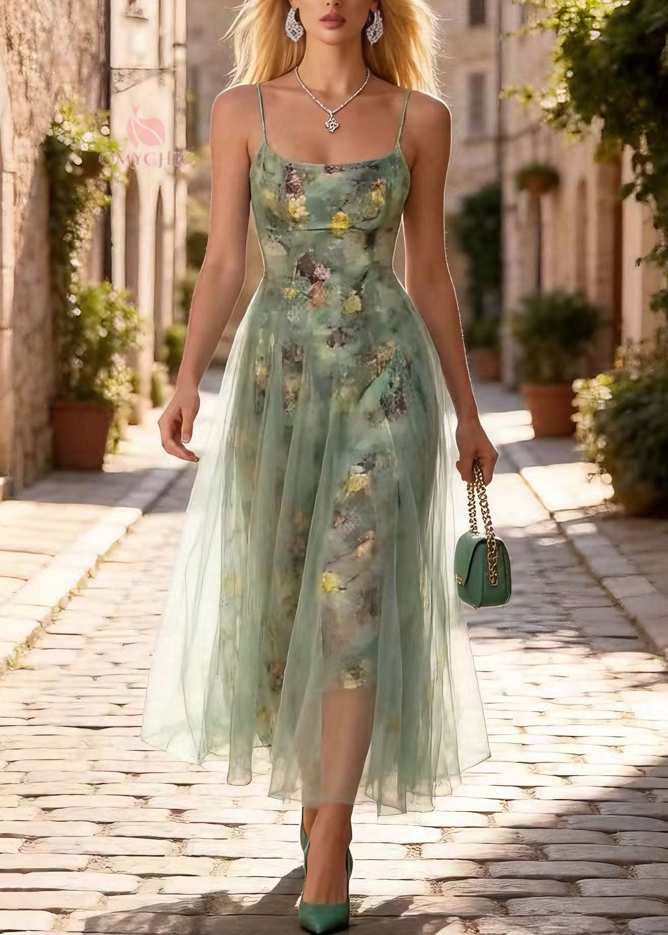 Chic Print Wrinkled Tulle Spaghetti Strap Dress Summer