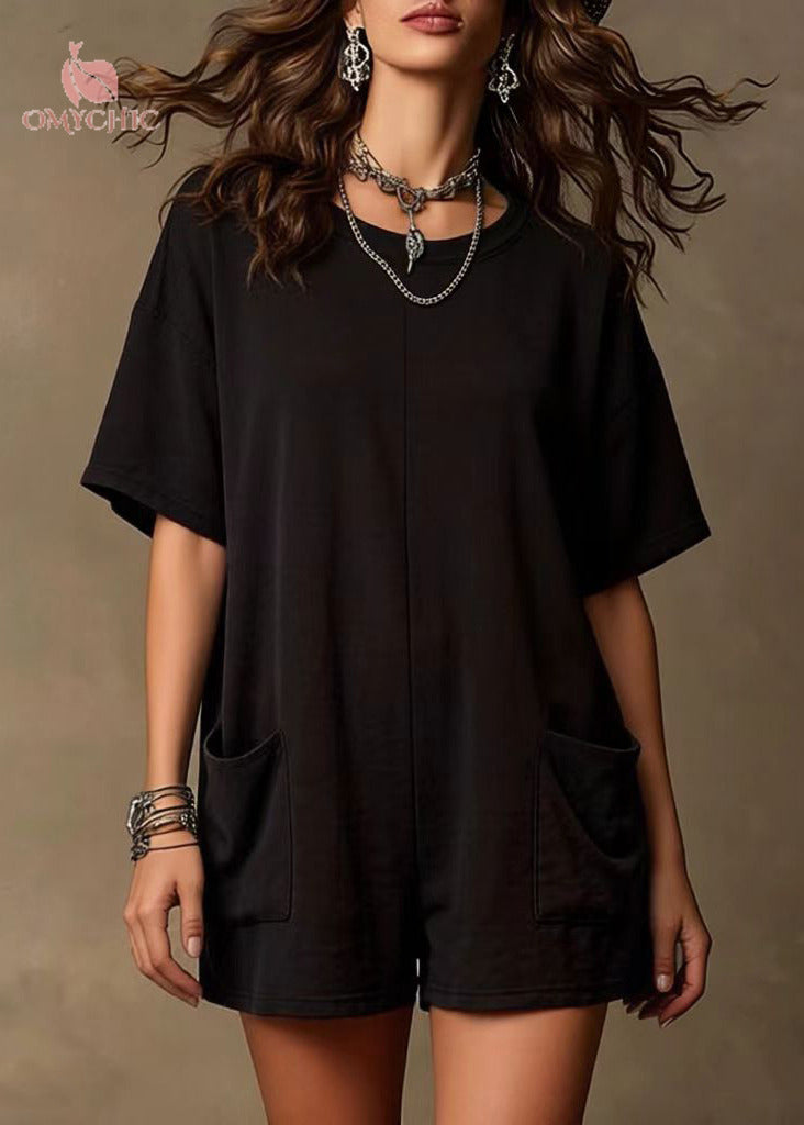 Style Black Oversized With Pockets Cotton Shorts Jumpsuits Summer