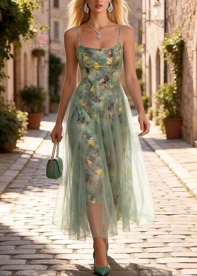 Chic Print Wrinkled Tulle Spaghetti Strap Dress Summer