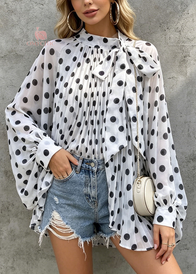 Chic White Dot Print Bow Chiffon Tops Batwing Sleeve