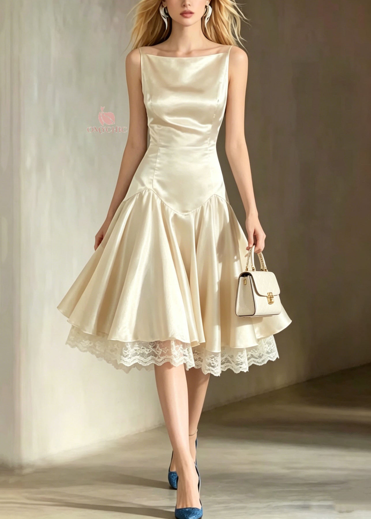 Italian Champagne Lace Patchwork Silk Spaghetti Strap Dress Summer